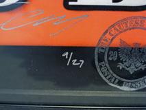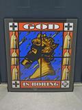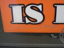 かなり過激な作品です。エリザベス女王の肖像画+ガスマスクを中心に、ミサイル弾、十字架、ローマ法王を配したインパクトある作品です。James Cauty 自らが生みだした架空の国の切手に表現された数々の作品はこのガスマスク姿のエリザベス女王を始めテロ、戦争、イラクがモチーフとなっています。この作品は艶消しタイプのプリントで、直筆サイン、9/27のシリアルナンバー、自らが生み出したCautese National Postageの郵便局スタンプが入っています。ポスターサイズに合わせて特注した重厚なブラックのアルミフレームで額装されています。フレーム幅5mmで作品を邪魔せずに美しく見せます。price はフレーム代込みのお値段です。