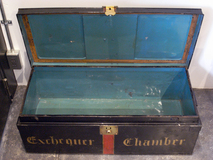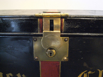イギリス製のスチールトランクです。レッドライン、 やや色褪せたゴールドの金具がポイントです。 内側のペイントは鮮やかなブルーで斬新な色の 組み合わせす。見せる収納としては勿論、テーブルや テレビ台などにもお勧めです。 フロントのExchequer Chamber= 財務府会議室裁判所 の意味 made in UK