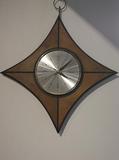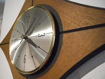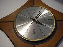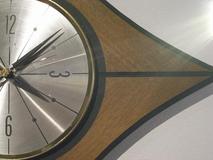 アメリカのELGIN社製のSTARBURSTデザインの壁掛け時計です。 チーク材のフレームにゴールド×ブラックの文字盤。 大きなリング状の金具にフックや釘で壁掛けするタイプです。