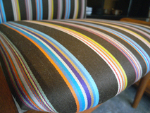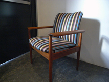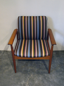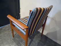 FINN JUHL デザインのアームチェア No.209は、 1960年前期にデンマークの家具メーカーFRANCE & SON の新シリーズとして1963年にパリにて発表されました。 遊びすぎていない上品なフォルムと削りだしのアームの 丸みが特徴です。アームの丸みはただの飾りでなく肘を 乗せた時に安定感を与えてくれます。 別名「ディプロマットチェア」と呼ばれており、その名 の由来通り、当時のデンマーク大使館の外交官のために デザインされました。張地はPAUL SMITH がアメリカの テキスタイルカンパニーMaharam Design Studioのために デザインしたストライプ柄で張替えています。チーク材