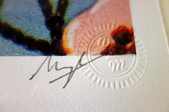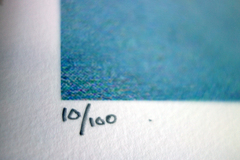 ジクリー(Giclee)とはフランス語で「噴射する」という意味。、ジクリープリントはアーティストの描いた原画を高精度のスキャナーでトレースし、コンピュータで最大数十万色まで分析した色彩のデータを利用して各色をミクロサイズのノズルで紙やキャンバスに噴射して制作します。ジクリーは現在原画にもっとも近いといわれ、臨場感溢れるプリント技法です。