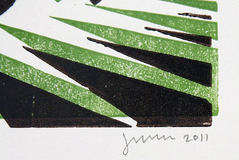*リノリウム版画: リノリウム版画=リノカットは、版画の一種で、木版ではなくリノリウムに絵柄を彫り、紙にプリントします。 木版と比べコントラストが強く、微細な表現も忠実に再現します。