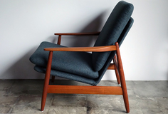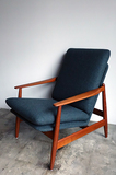 代表作コロナチェアが有名なポールM.ヴォルター デザインのイージーチェア、モデルNO.340 チーク材仕様です。フレームは古い塗装をすべて剥離 した後にオイル+蜜蝋ワックスで再塗装済みです。 張地はイギリスMOON社製の上質なヘリンボーンツイード 素材で張替え、ウレタンも新規交換済みで、 フルメンテナンス済みです。 manfufacturer: Frem Røjle. designer: Poul M.Volther made in Denmark