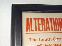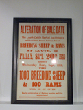 1940年UK LOUTH で開催された養山羊、養羊を 売買するオークションの日程変更をお知らせする ポスターです。行ごとに様々な字体を組み合わせ たデザインが印象的です。ポスターサイズに合わせて 別注した木製のフレームに額装済みで、フレーム代 込みのPRICEです。(店頭在庫) printed in UK