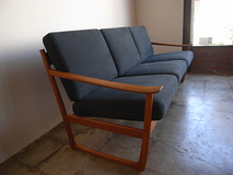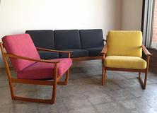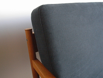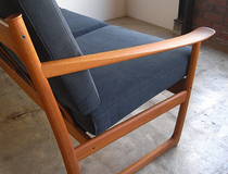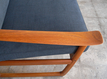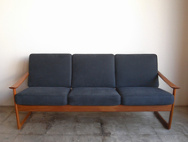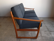 ピーター・ビット&オルラ・ムルガード・ ニールセンによる 3人掛けソファーです。1961年のデザインです。アームレスト、 脚が一体となったソリのようなデザインが特徴です。 イタリア製の肌触りの良いコットンリネンで張替済み(ダークネイビー)。 中材ウレタン新規交換、スプリング調整、座面下裏地も新規交換して おります。同シリーズの一人掛け、テーブルも入荷しております。 座面の高さ43cm