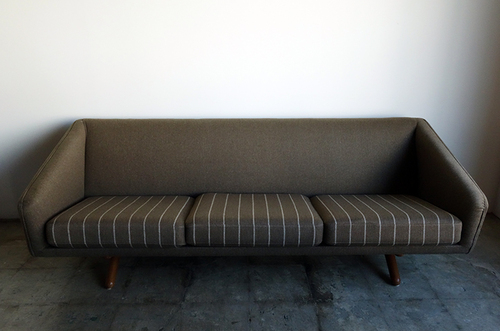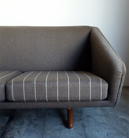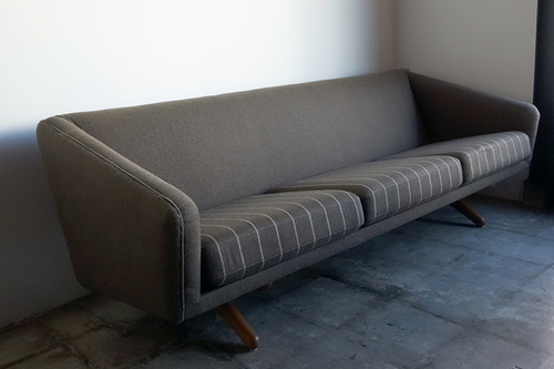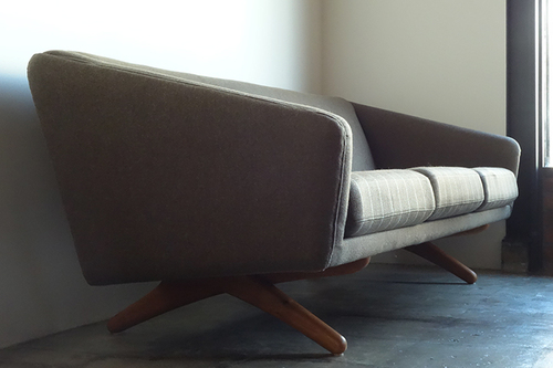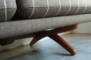 3seats Cross leg sofa モデルNO.ML-90 イルム・ヴィッケルソーデザインの3人掛けソファです。 クロスした脚のデザインが特徴です。脚部の材質は オーク材で、 張替前の状態です