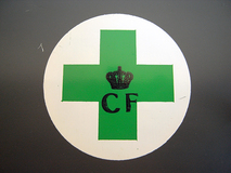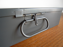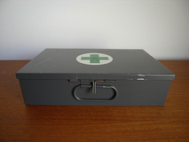 デンマークの民間軍CIVILIAN FORCE 用の メディカルケース+三角巾、安全ピンセットです。 グレィッシュグリーンのスチールケースは 小物収納や玄関のキーケース、文具入れなど としてお薦めです。