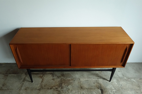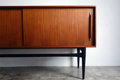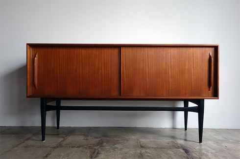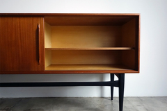 コンパクトなサイズのデンマーク製サイドボードです。 引戸仕様、幅150.5cmと小さめのリビングスペースにも 配置できるサイズです。シャープなブラック塗装の脚、 無垢材を削りだした引手とシンプルなデザインながら 細部に拘りを感じます。