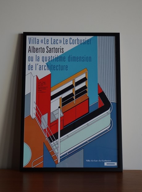 建築家アルベルト・サルトリス「建築物の4次元」展 のポスターです。ル・コルビジェが両親の為に建てた スイス コルソーのレマン湖のほとりにある私邸 Villa «Le Lac» le Corbusierが美術館として公開されて おり、そこで開催された個展のオリジナルポスターです。