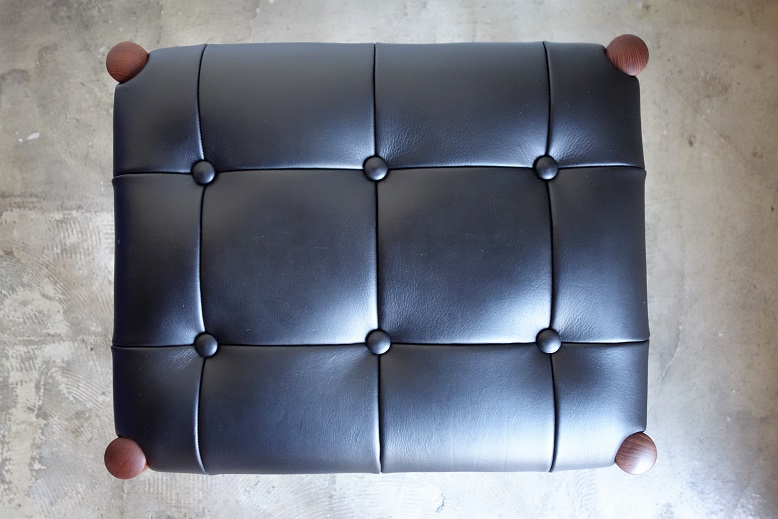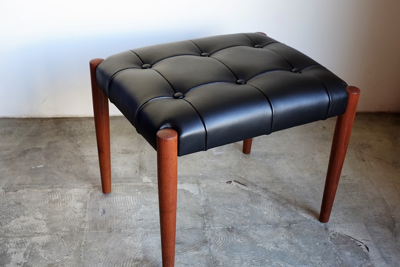 ブラックの牛革レザーでパッチワークし 張り替えました。様々なスタイルのソファや チェアに合わせやすいデザインです。 また、玄関の靴ばき用にも適したサイズです。 木部はチーク材で再塗装仕上げ済みです。