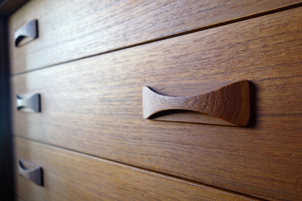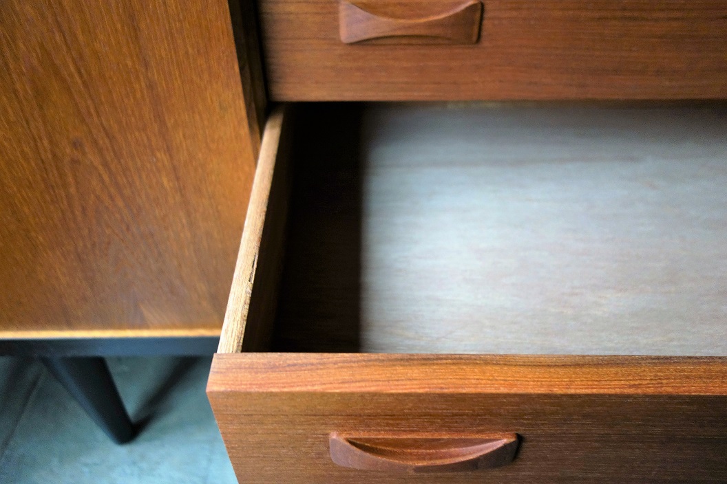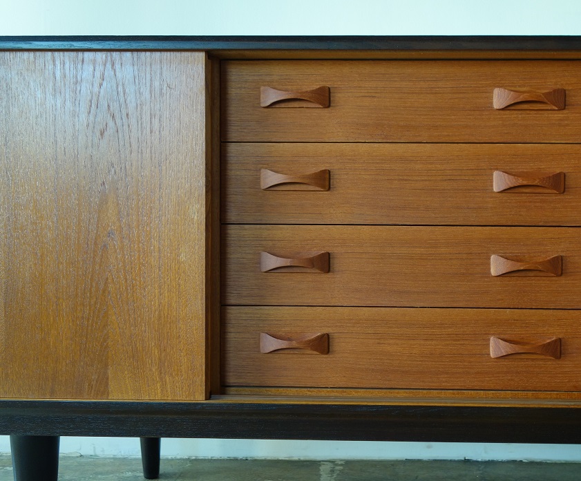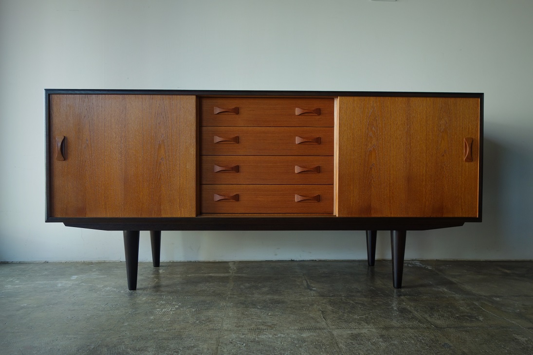 デンマーク製コンパクトなサイズのサイドボード です。引戸仕様で扉の開閉スーペースの確保 がいらず小スペース対応型です。チーク無垢材 仕様の引手がデザインポイントです。 天板、側板、脚部はブラック塗装、前面がチーク となります。 左右収納スペースの棚板は可動式となります。 左右収納有効寸法:幅51×奥行き41.5×高さ43.5(cm)