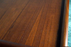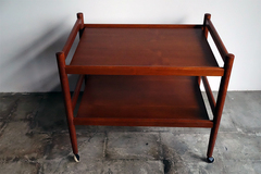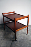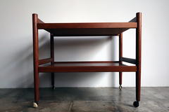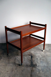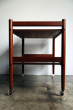 シンプルなスタイルのデンマーク製の トローリーです。アイボリー×ブラックの配色 キャスターがポイントです。ダイニング、リビング、 書斎と様々なシーンでご活用戴けます。 天板は上段、下段ともに古い塗装を 剥離後に再塗装仕上げをしており、 きれいな状態です。材質はチーク突板+無垢材 仕様です。