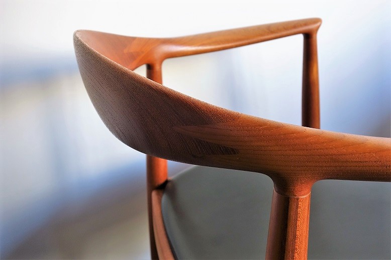 アームと背をつなぐフィンガージョイントの部分を アクセントとして見せる笠木は優美な曲線を描き 背にやさしく寄り添います。アームは先端に向かい 微妙に反り返り、内側に入り込むような形状で 肘をかけると肩の力がすっと抜けるような心地よさ を感じます。 前後左右全方位どこから見ても美しいプロポーション と極上の掛け心地の良さを併せ持つパーフェクト な仕上がりが具現化された究極の椅子です。 古い塗装を剥離後に再塗装仕上げ済み、革はお好きな 色で新規に張替てお渡しします。