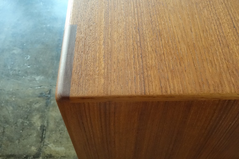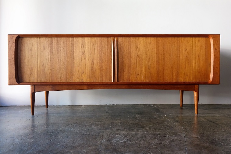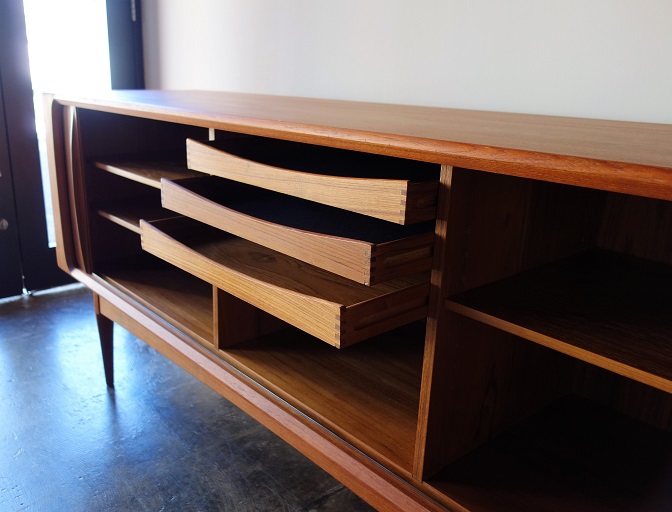 左右両サイドに収納される蛇腹式の扉が特徴の デンマーク製チーク材のサイドボードです。 扉の影に影響されない広々と明るく開放的な 収納部分は収納物を取りだしやすく、扉の飛び出しが ない分、道線を邪魔しない作りです。引き出しの フェルト交換、再塗装済みです。 manufacter: Bernhard Pedersen & Son made in Denmark