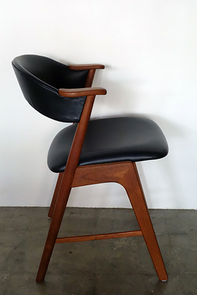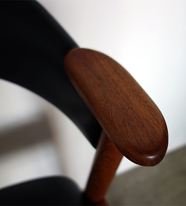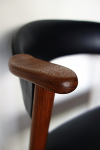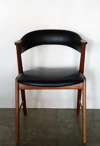 カイ・クリスチャン デザインのアームチェアです。 材質はチーク材です。背中をやさしく包み混む 背もたれに、テーブルから大きく飛び出すことのない コンパクトなアームデザインが特徴です。 ブラックの牛革スムースレザーで張替済み フレームは古い塗装をすべて剥離し、サンディング 後にオイル+ワックスで再塗装済みです。 1台のみ入荷です