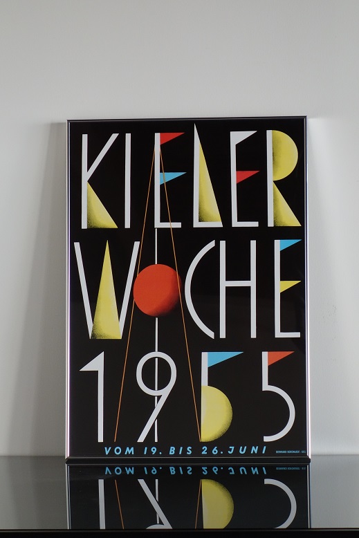 1882年より毎年6月の最終週にバルト海に面したドイツ北部 の都市キール市で開催されるセーリング大会を主体として フェスティバル「キール週間」=Kieler Woche のプロモーション ポスター。このイベントのポスターは若手グラフィックデザイナー の登竜門的存在でドイツではコレクターアイテムにもなっています。 1955年大会のオリジナルポスター オフセット印刷 Designer : Bernhard Borgwardt printed in Germany