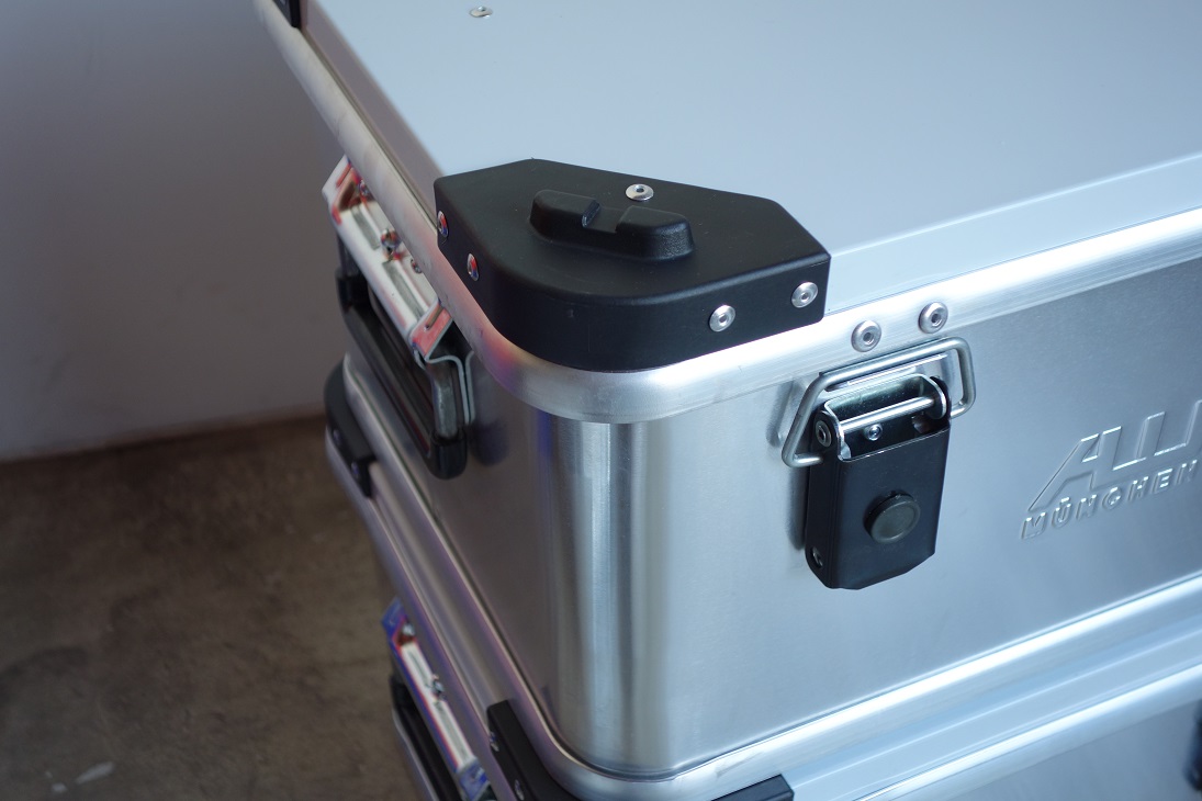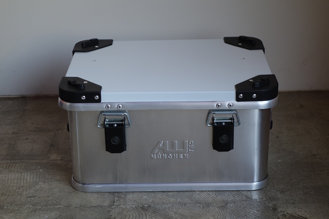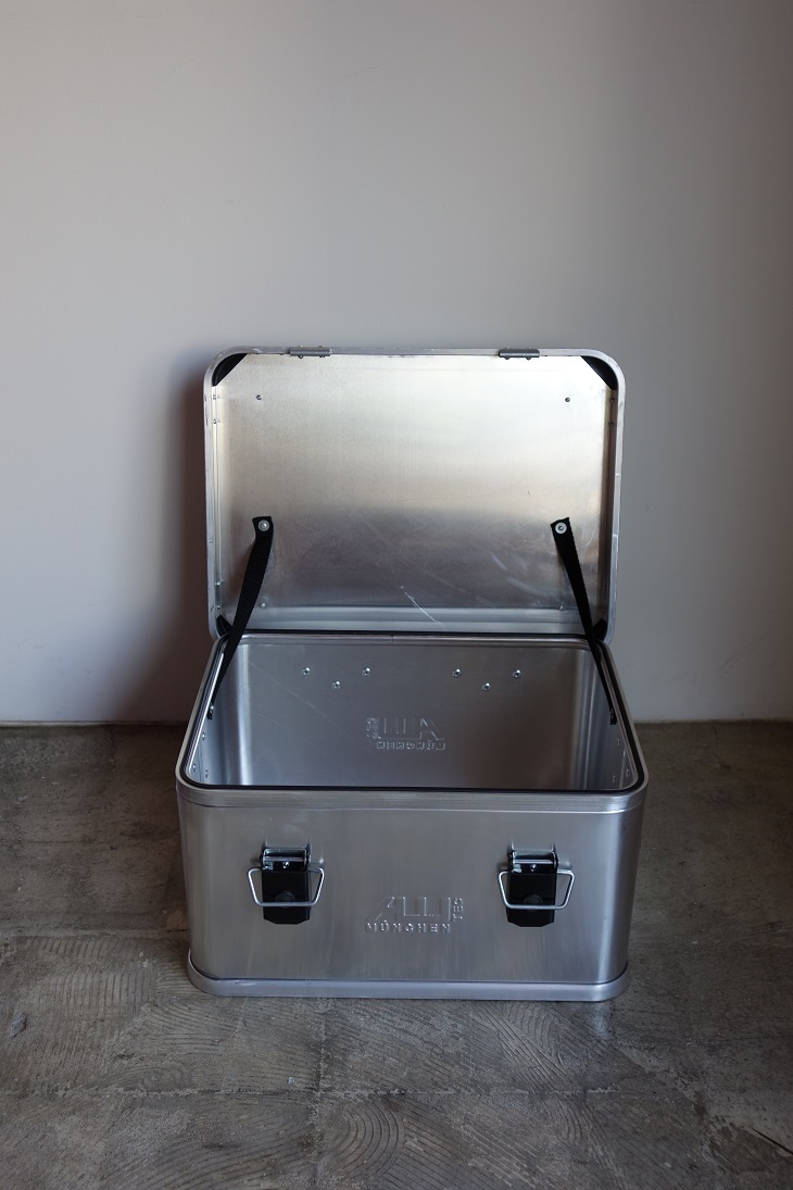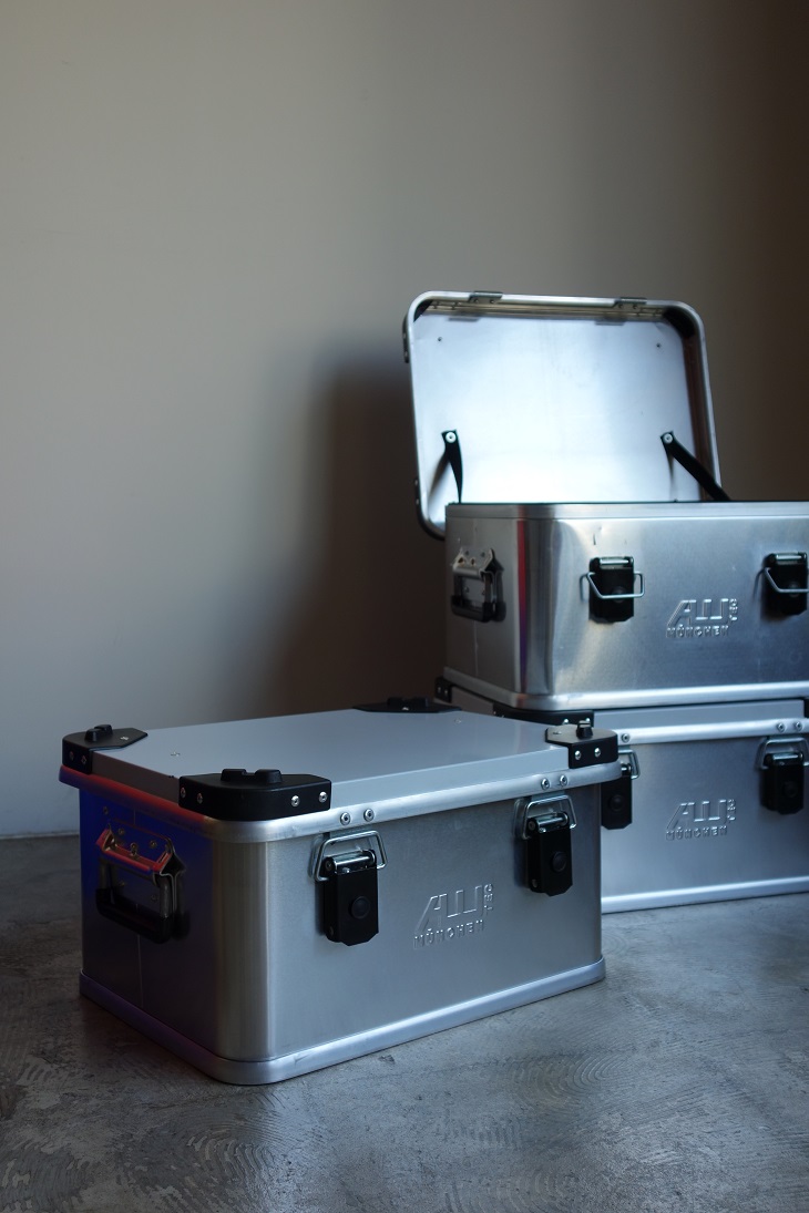 ドイツALU München社製、ストレージボックス 材質はアルミニウム、未使用のデッドストック になります。スタッキングしてお部屋の見せる収納 として、ガレージや車内収納箱、工具入れとしても お薦めです。 蓋上部には傷防止用のWHITEのラミネートカバーが 付いております。こちらはそのままでも、剥がして アルミ剥き出しの状態でもどちらでもご使用戴けます。 両サイドハンドル付き、蓋四隅にコーナープロテクション付き