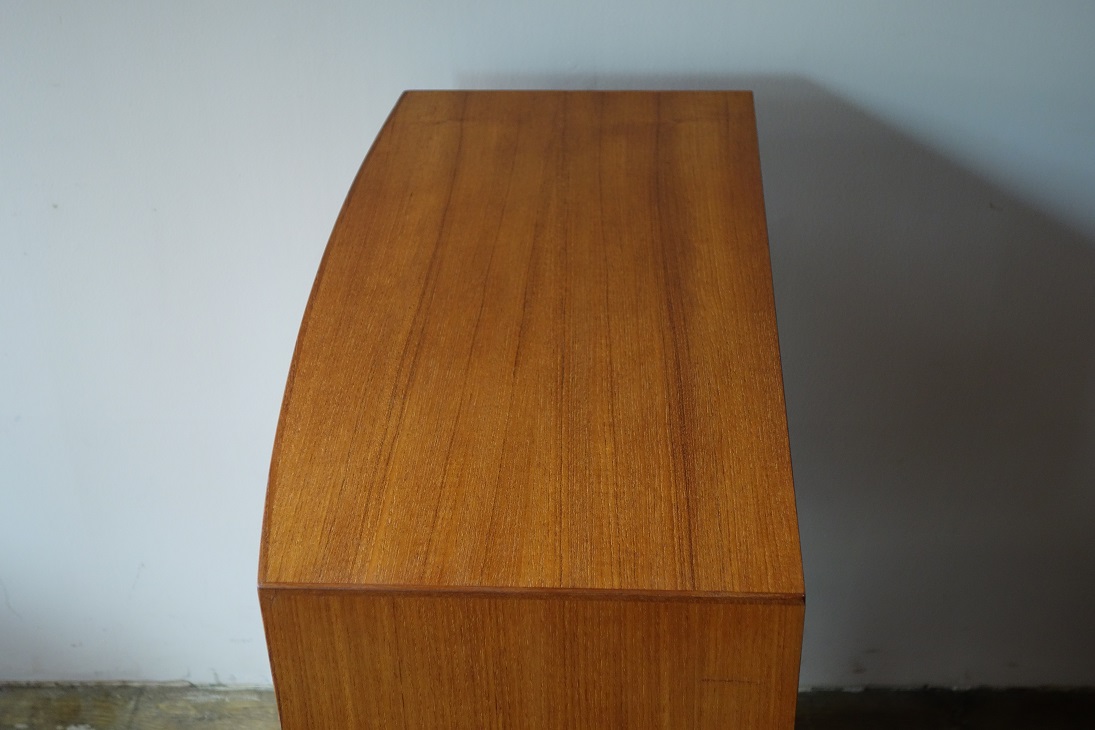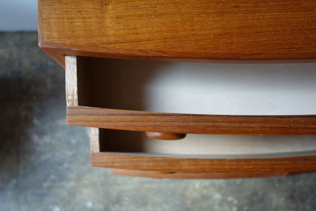 コンパクトなサイズの5段チェスト、カイクリスチャンセン のデザインです。ラウンドハンドルがアクセントで効いた デザインです。奥行きは両サイドで28.5㎝、中央で31.5㎝ となります。材質はチーク材で再塗装済みです。 made in Denmark
