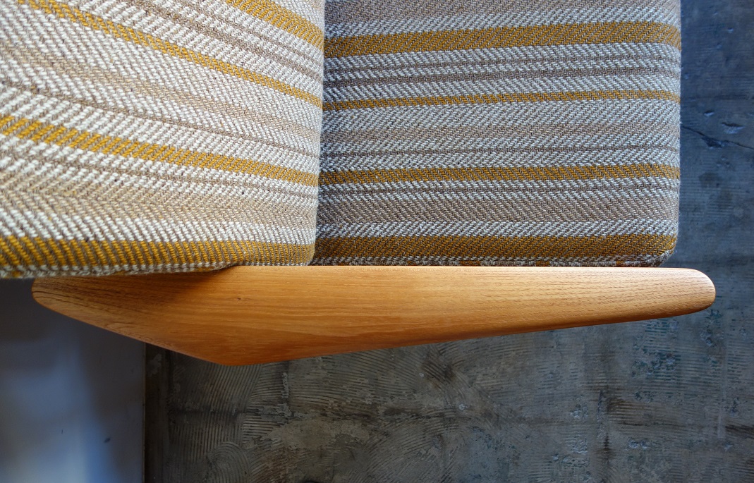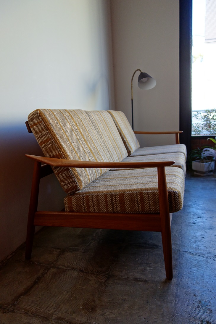シャープなラインの無垢材を削り出したアームデザイン と背面の大胆なフレームワークが特徴のArne vodder デザイン の3人掛けソファーです。良質なチーク材を贅沢に使用しており、 木目の美しさを堪能していただけます。 張替前の状態です。内包のスプリング調整、ウレタン材新規交換、 座面下裏地新規交換してのお渡しとなります。お選びいただく 生地によりお値段は前後いたします。