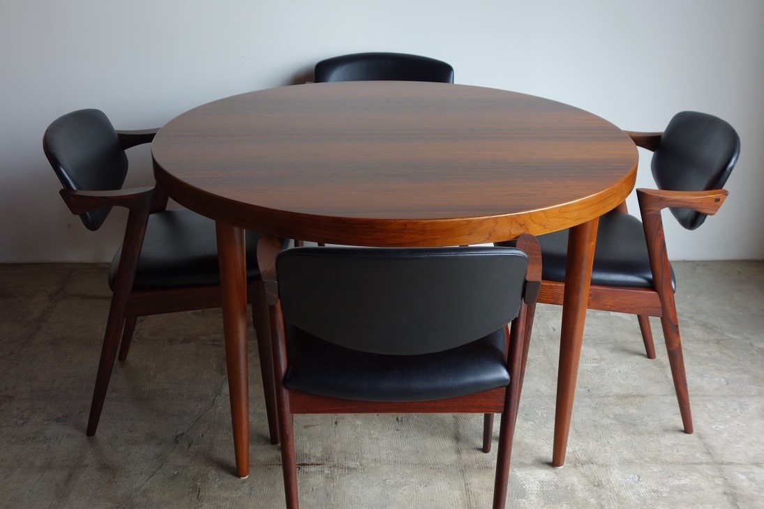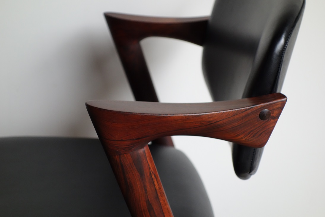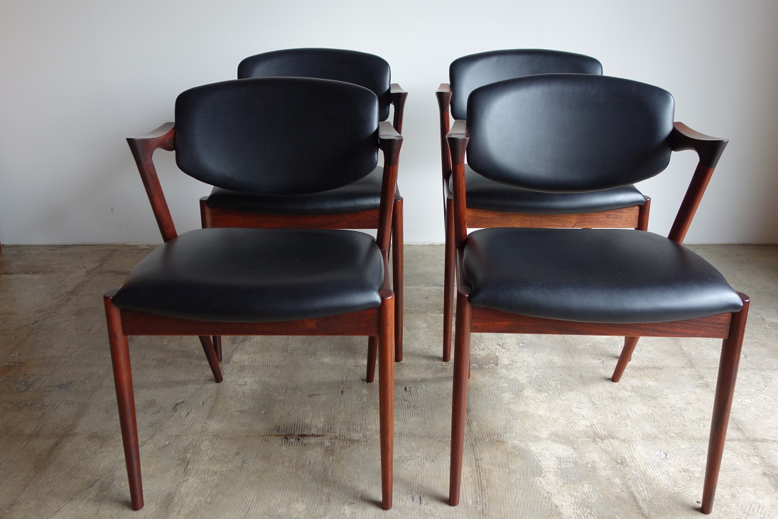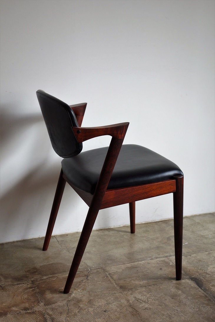 NO.42 ダイニングチェア、カイ・クリスチャンセンの デザインです。材質は希少なローズウッド、張地は 革の風合いをそのまま生かした塗装膜のないアニリン 仕上げの牛革で張替済み。色はブラックです。 内部のウレタン、座面下のベルトすべて新規交換済み、 フレームは古い塗装をすべて剥離し再塗装済みで フルメンテナンス済みでの販売です。