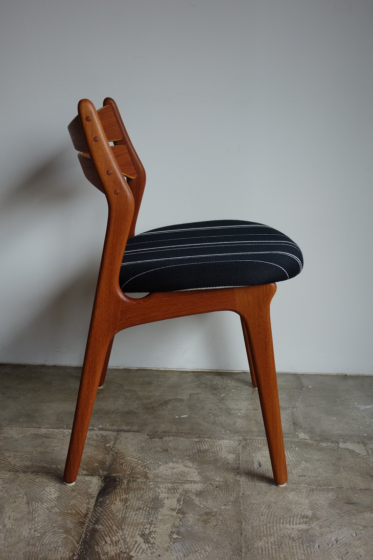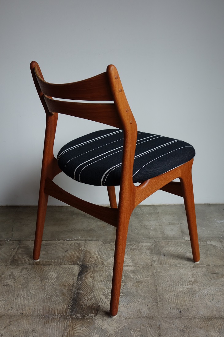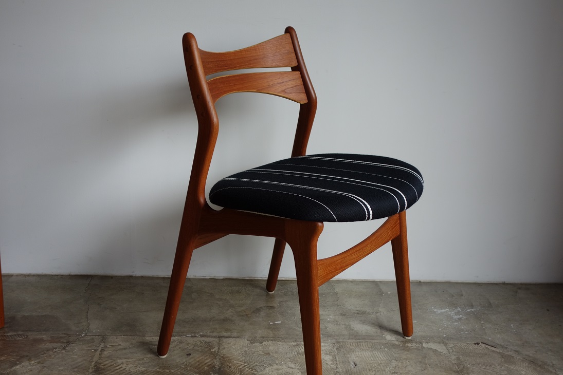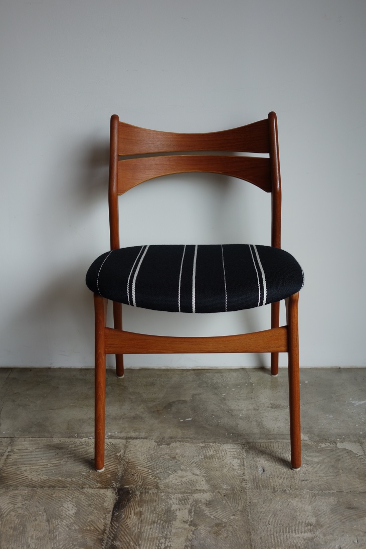 エリック・バック デザインのダイニングチェアー MODEL NO. 310 入荷しました。 です。チーク無垢材を贅沢に使用し背面フレーム、 後ろ脚と一体となったしなやかな"く"の字型のラインが 特徴です。また、しなやかな曲線を描き、背中の形状に 沿い吸い付くようにしっかりとホールドしてくれる背もたれは 機能美と言えます。大きめサイズの座面で大柄な方も ゆったりとお座り戴けます。 フレームは古い塗装をすべて剥離し、サンディング後にオイル、 ワックスで再塗装仕上げしております。 張地はDanish Art Weaving社製のストライプ生地で。 コットン、ウールの混紡です。