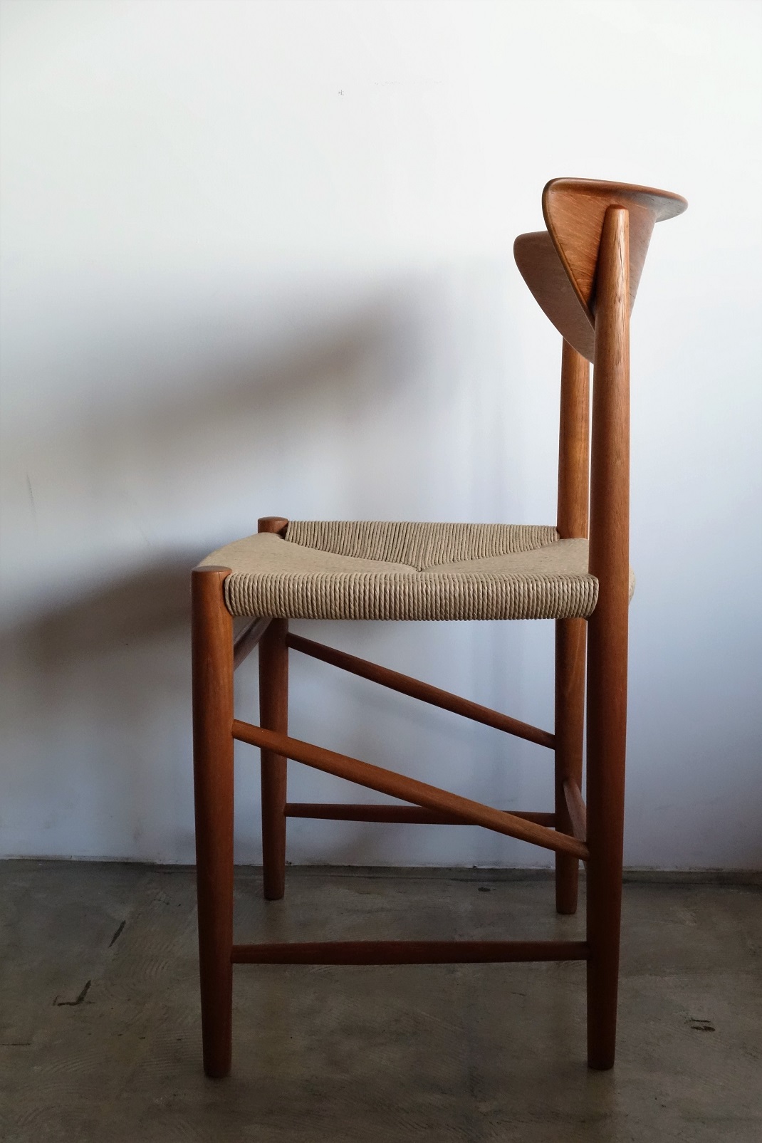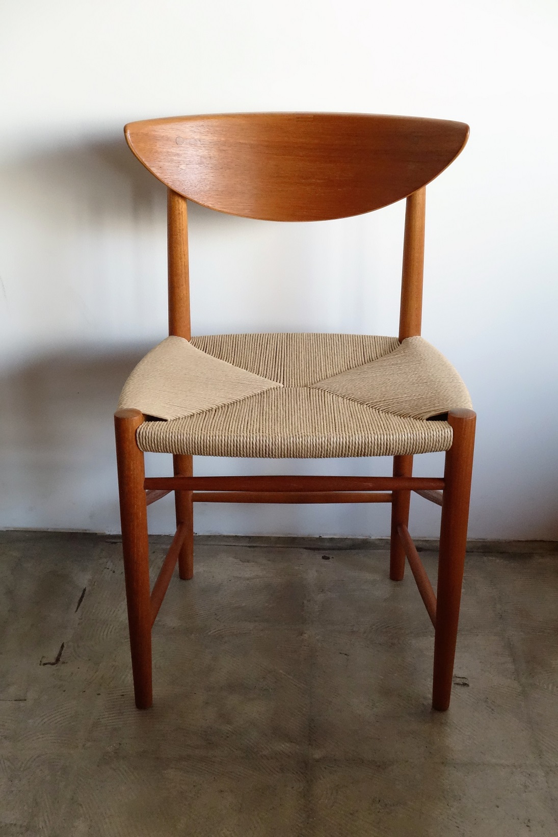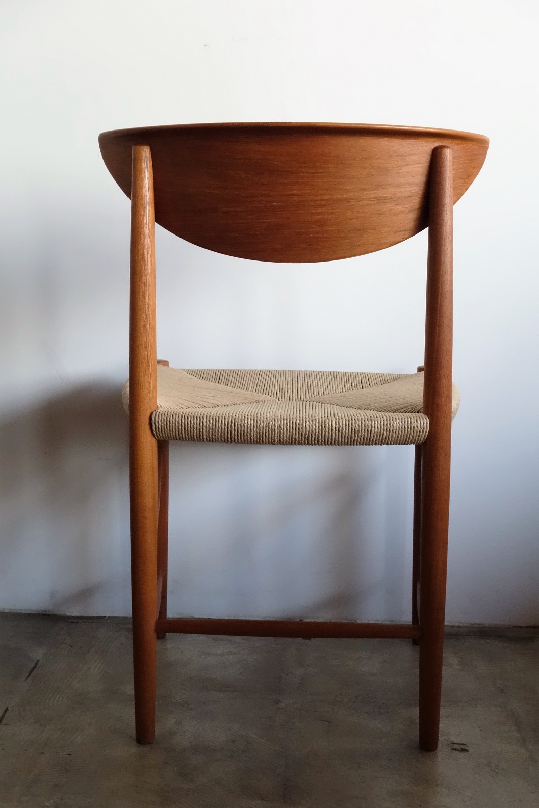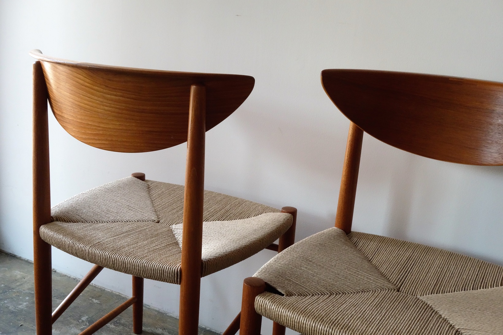 Model ナンバー316 ピーター・ヴィッツ& オーラ・ミュルゴー・ニールセンによる1955年の デザイン。、美しい弧を描くアール状の背もたれに ストレートに配した前後の脚は柔らかで優しい中にも 潔さを感じるデザインです。前後の脚をつなぐ斜め貫は 強度を高めるとともにデザインポイントにもなっています。 全方位どこから見ても美しく隙のないデザインです。 古い塗装はすべて剥離し、再塗装仕上げ済み、座面は デンマーク製のペーパーコードで新規張替、フルメンテ ナンス済みでの販売となります。座面の高さ43.5㎝ 2脚倉庫在庫(メンテナンス中)在庫計2脚 Designer: Peter Hvidt & Orla Mølgaard Nielsen manufacture: Soborg Mobler made in Denmark