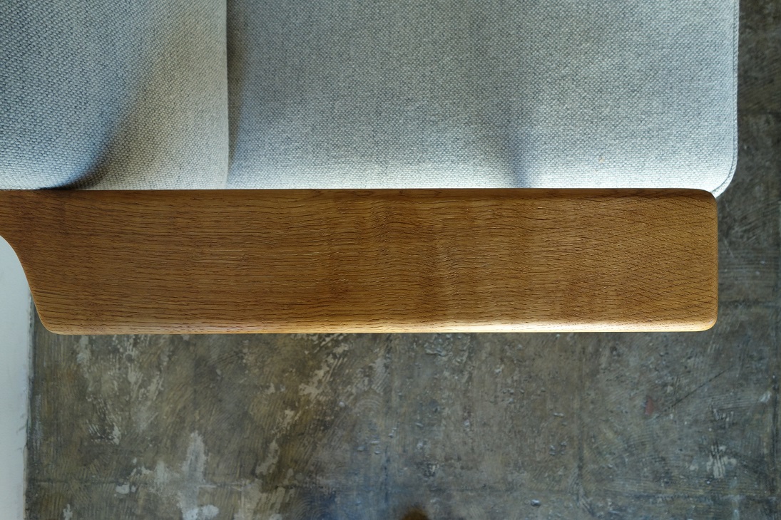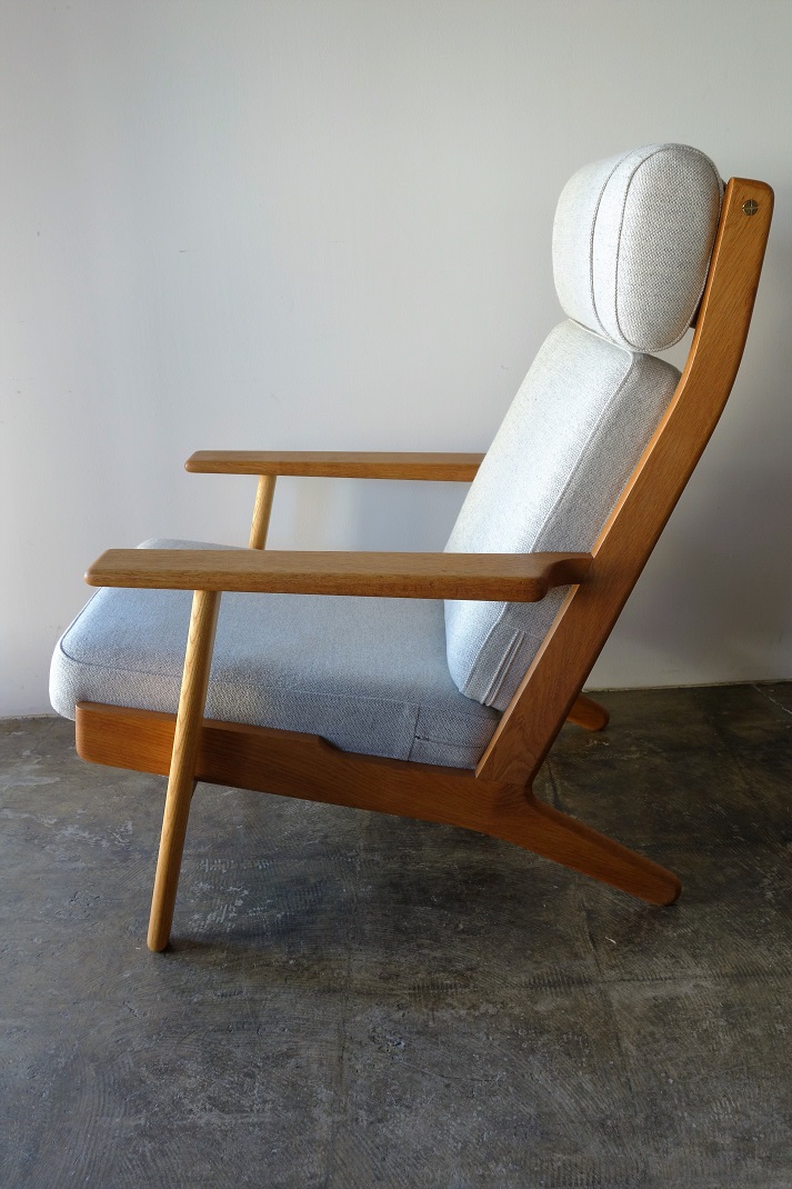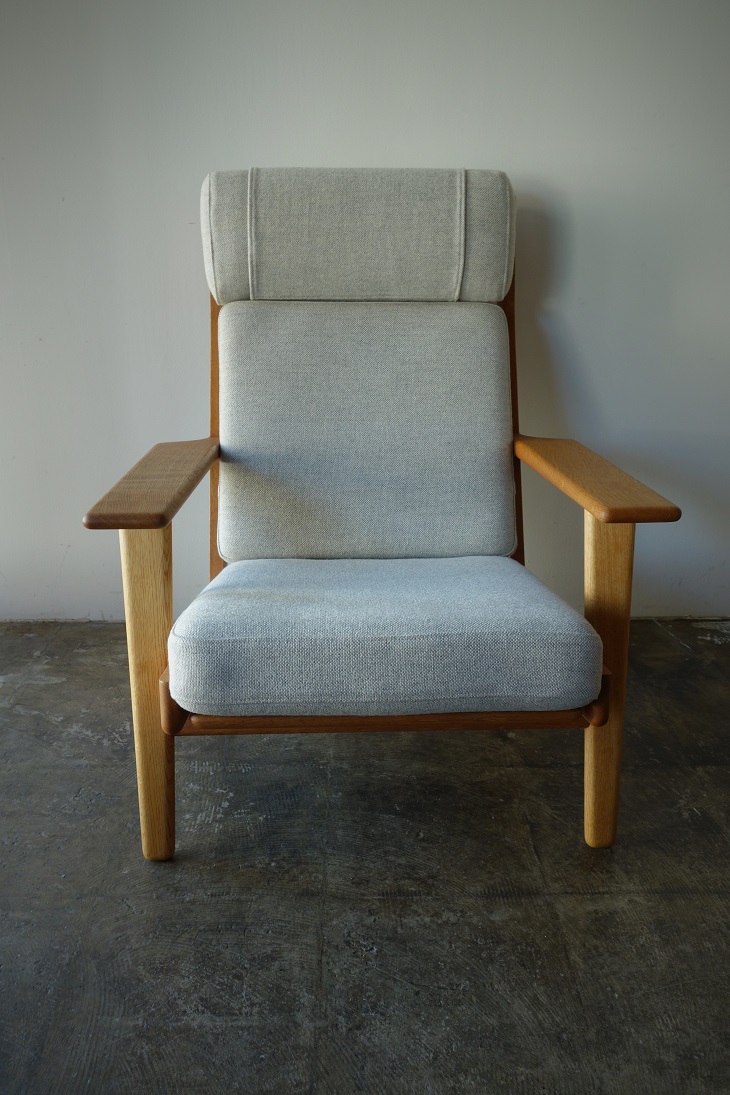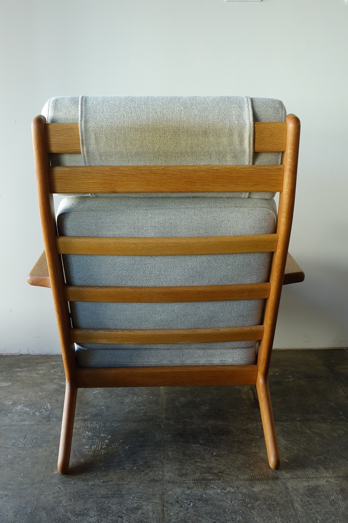 ハンスJ.ウエグナーデザインのハイバックチェア チーク材仕様。クッションは張地、ウレタン材を全て 新規交換致します。内包のスプリング調整し、座面下 のキルトも新調します。フレームは全て古い塗装を剥離し、 オイル+ワックスで再塗装仕上げしております。