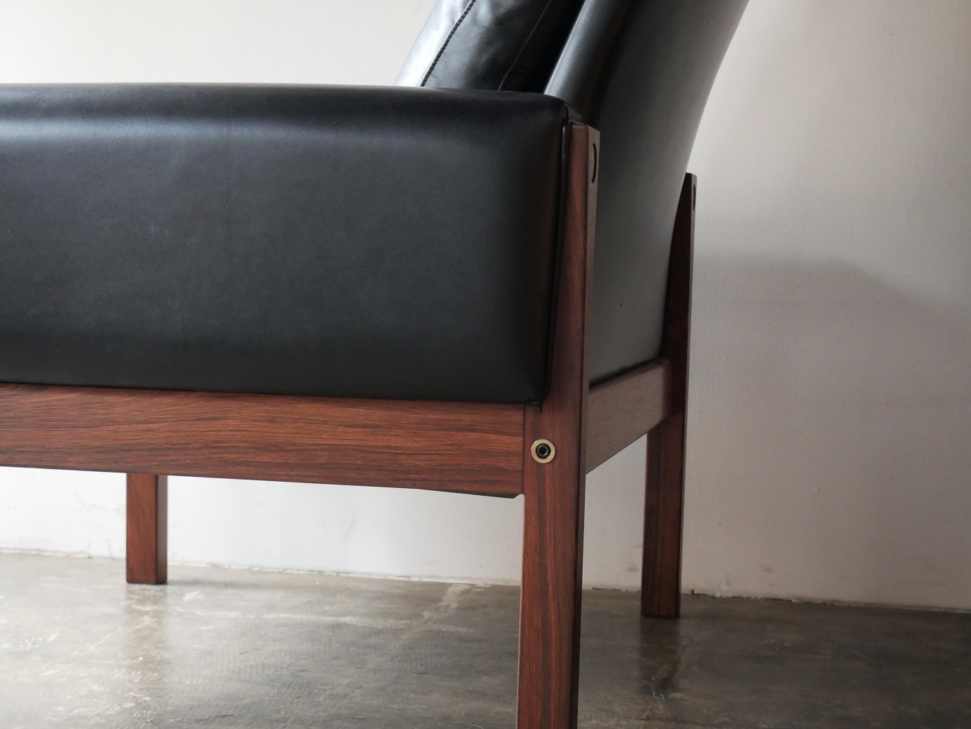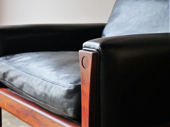 ハンス・ウエグナー1965年のデザインAP62ハイバックチェア です。 重厚なローズウッド仕様です。フレームは木目の美しいブラジリアン ローズ、熟練の職人が丁寧に古い塗装を落としオイル+ワックスで 再塗装仕上げを施し、美しい艶が蘇えりました。張地は革本来の 自然な風合いを生かしたアニリン仕上の牛革ブラックで全面張替、 中材もすべて新規交換、羽毛(フェザー)をたっぷりと詰め込みました。 フルメンテナンス済みでの販売となります。