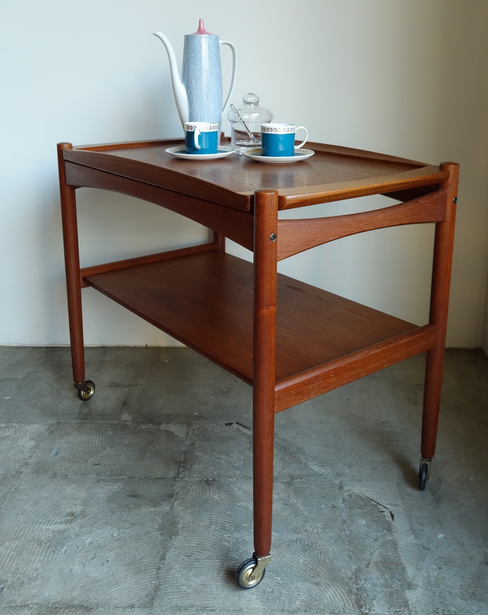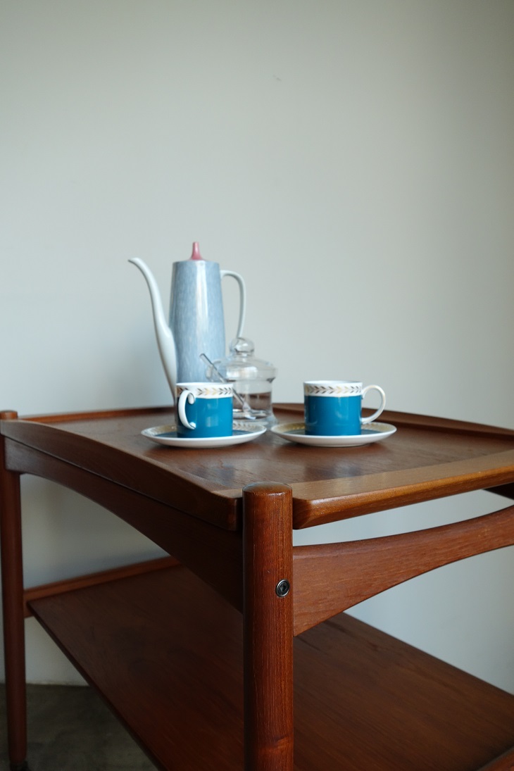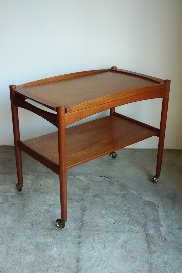 デンマーク製チーク材のトローリー テーブルです。上段のトレーは着脱式で 取り外し可能です。レトロなデザインの キャスターもポイントです。ダイニングは勿論 リビングでサイドテーブルとして、デスクサイド にご使用いただくのもお薦めです。