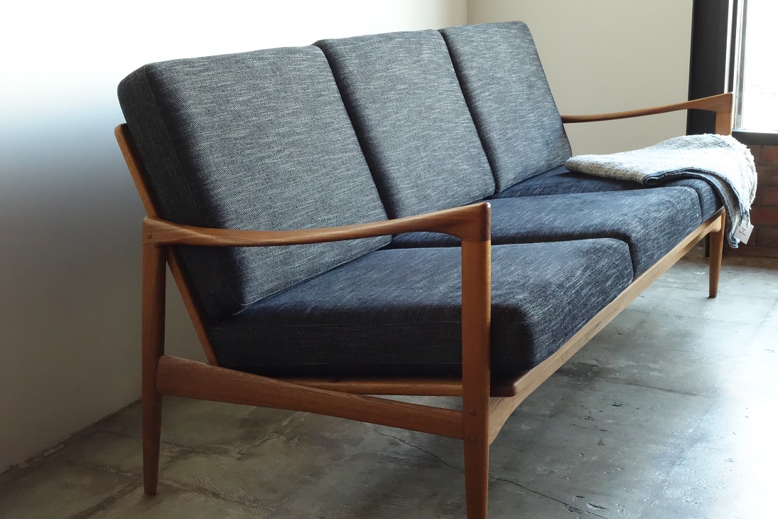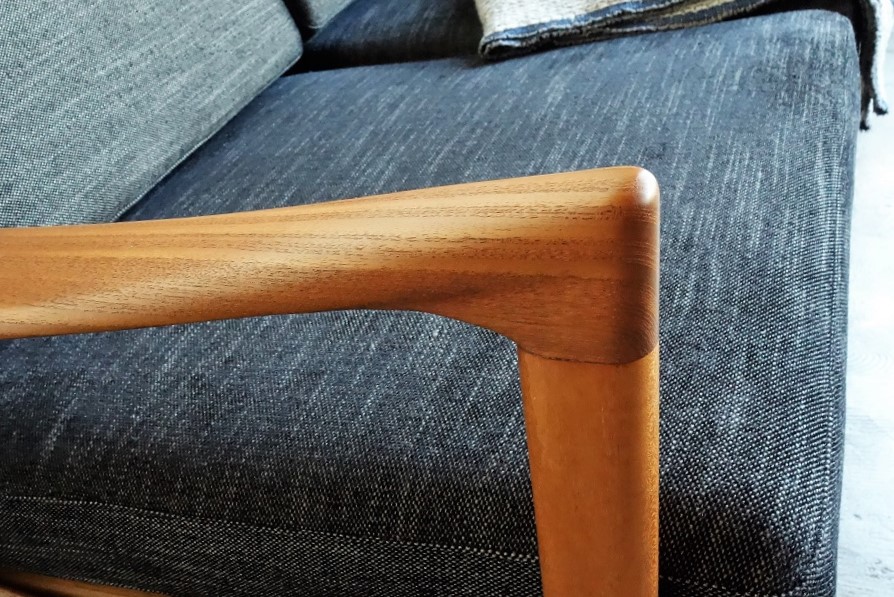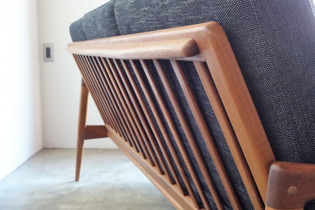 しなやかなラインのアーム、美しく処理された背面 フレームが特徴です。フレームは古い塗装を剥離後に オイル+ワックスで再塗装済み。クッションは張地 中材ともに新規交換済みです。張地は滑らかな肌触りの ベルギー製生地を使用しました。