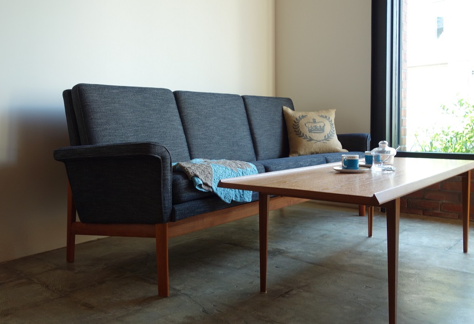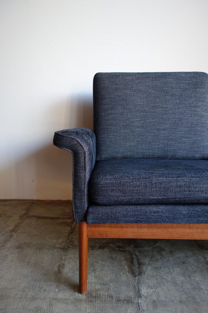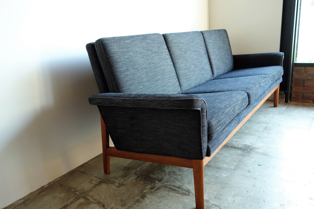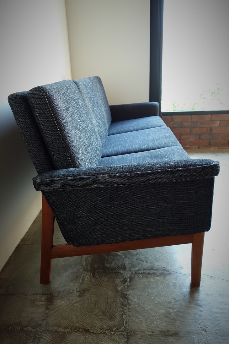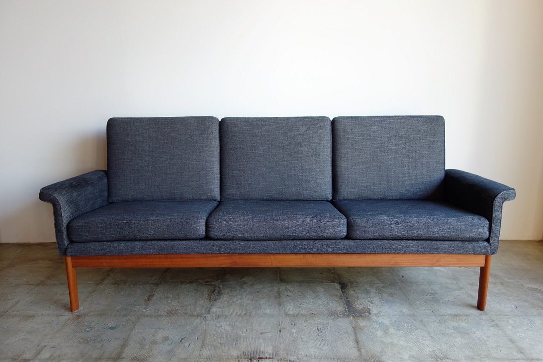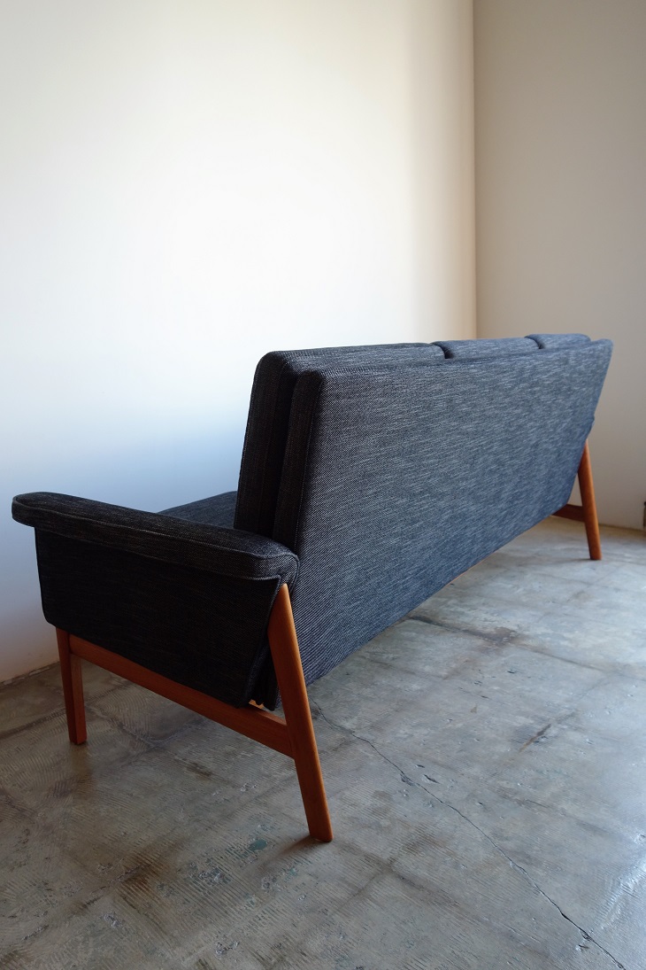 1965年 Finn Juhl デザイン ジュピターシリーズ の3人掛けソファーです。 背座ともに2層構造でしっかりと体を受け止めてくれます。 フレームはチーク無垢材で前後の脚は視界に入る前面部分 を楕円に削り込んですっきりと見せています。アームは 優しいカーブを描き、前面、側面、背面とどの角度から見て も美しい形状で実用且つデザインのアクセントにもなっています。 ベルギー製のヴィスコースミックス素材で張替済み、 ウレタン全面交換、座面下ばね調整、木部フレーム 剥離再塗装済でフルメンテナンス済みでの販売です。