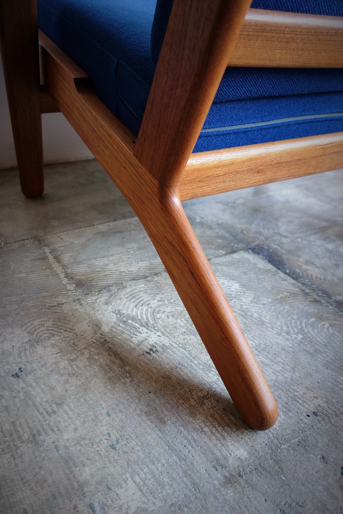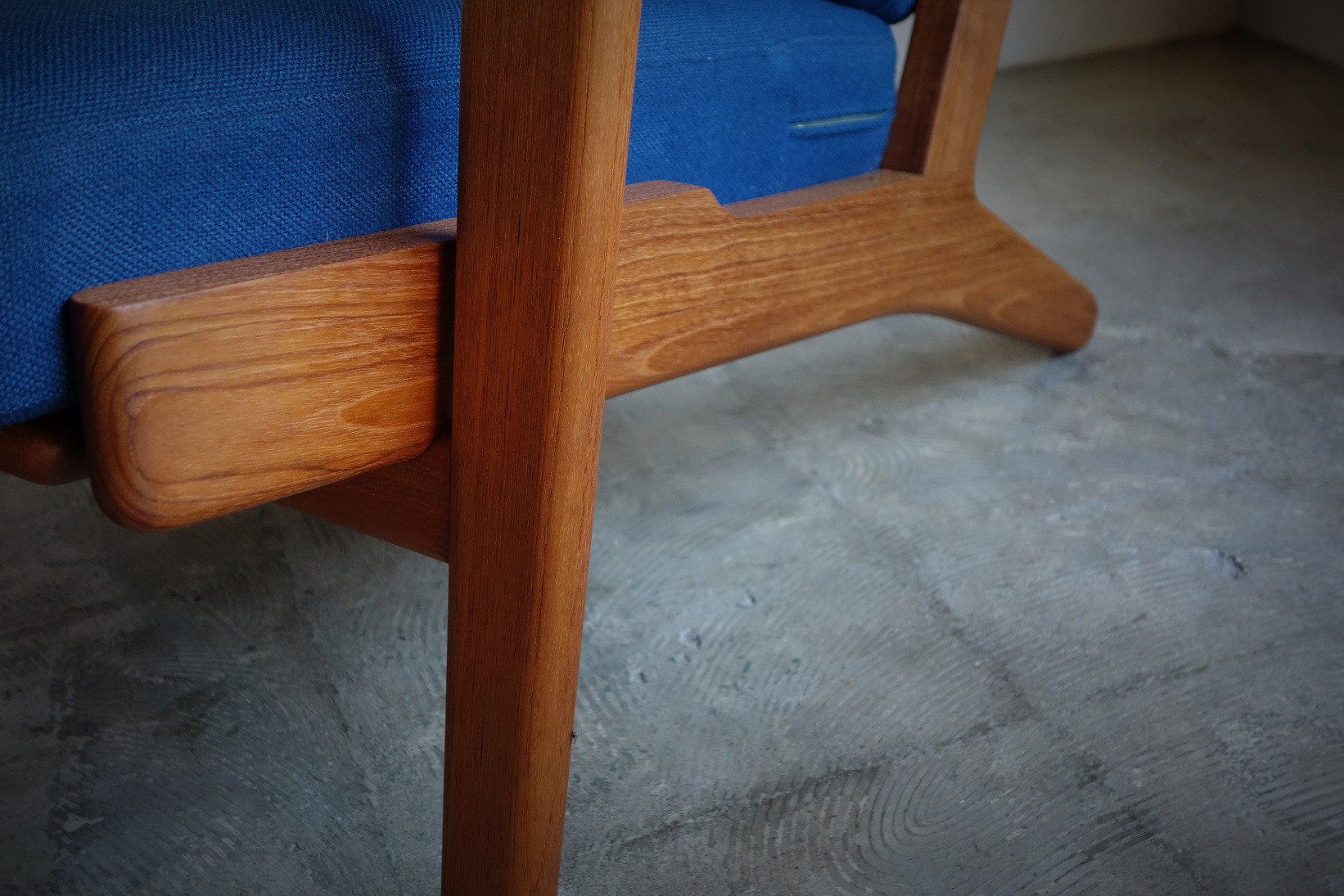 ハンス・J・ウエグナーデザインGE-290A ハイバックチェア+ オットマンのセットです。GETAMA社製、希少なチーク材 仕様です。ヘッドレストは可動式で、カバー付きです。 フレームは古い塗装をすべて剥離し、オイル+ワックスで 再塗装仕上げ済み、張替前の状態です。クッションの内包スプリング は調整し中材のウレタン、座面下のキルトもすべて新規交換致します。 長くご使用戴けるようフルメンテナンスしてのお渡しとなります。 それぞれゲタマ社の焼印あり
