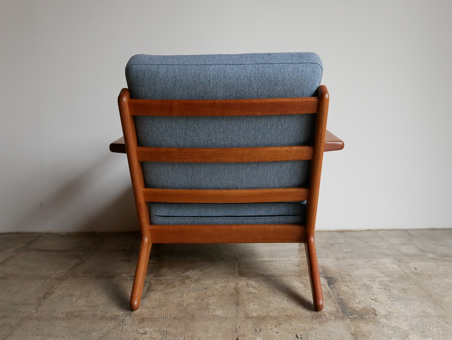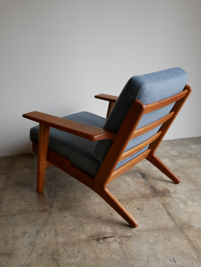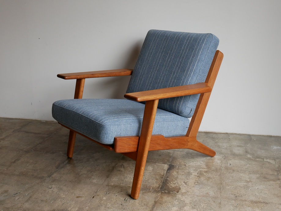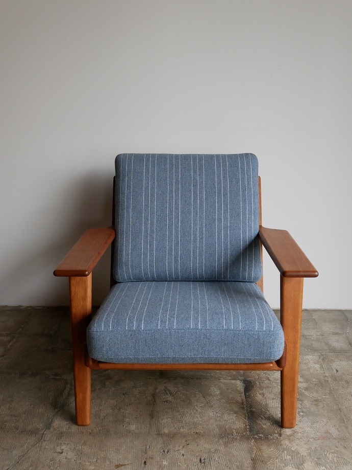 ハンス・J・ウエグナーデザインGE-290 一人掛けです。 GETAMA社製、材質はオーク材です。 フレームは古い塗装をすべて剥離し、オイル+ワックスで 再塗装仕上げ済みです。クッションの内包スプリングは調整し中材の ウレタンもすべて新規交換済みです。張地はデンマークのケヨラップ社製 ライトブルーのストライプと無地の組み合わせで張替てあります。 座面下のキルトも新規交換 し、長くご使用戴けるようフルメンテナンス済 みとなります。