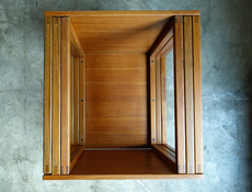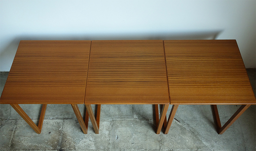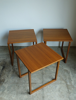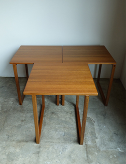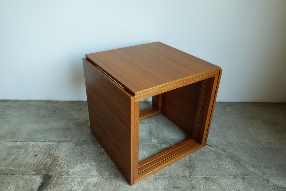 カイ・クリスチャンセン デザインのキューブネスト テーブルです。同サイズのテーブル3点が箱状に重なる ユニークなデザインです。テーブルの脚巾を外、中、内側と 3段階にする事でそれぞれの脚が見事に重なり合い 美しく一体化します。機能性とデザイン性が見事に融合した 意匠性の高いネストテーブルです。表示サイズは重ねた 状態でのサイズでそれぞれ単体ではW40×D40×H41.5(cm) となります。古い塗装を剥離後に全面再塗装済み