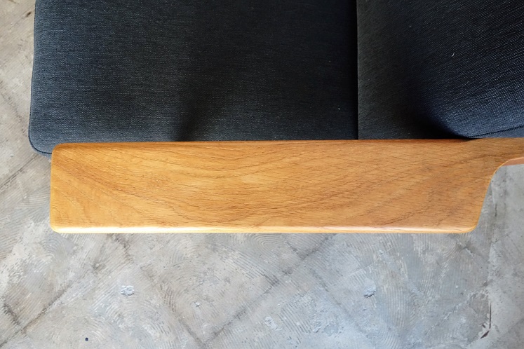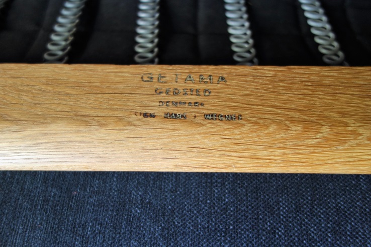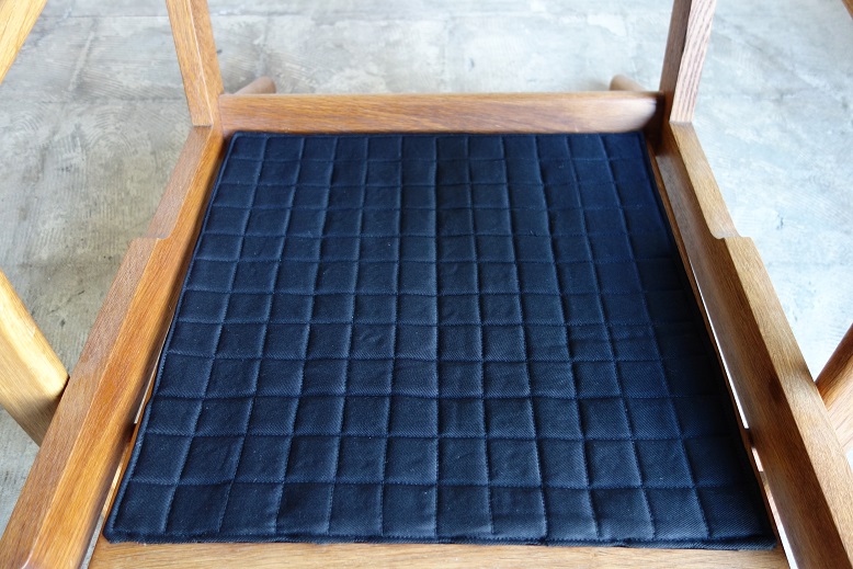 クッションは張地(イタリア製ダークネイビーブルー色、コットン混素材) ウレタン材を全て新規交換済み、内包のスプリングも調整しています。 座面下のキルトは新規交換、フレームは全て古い塗装を剥離し、 薄く研磨後にオイルで再塗装仕上げしております。フルメンテナンス済み での販売となります。