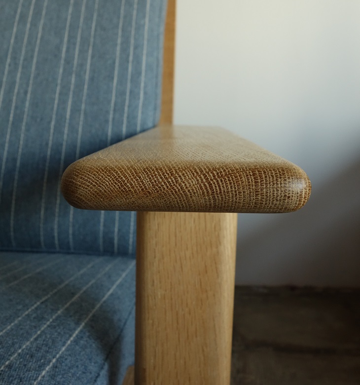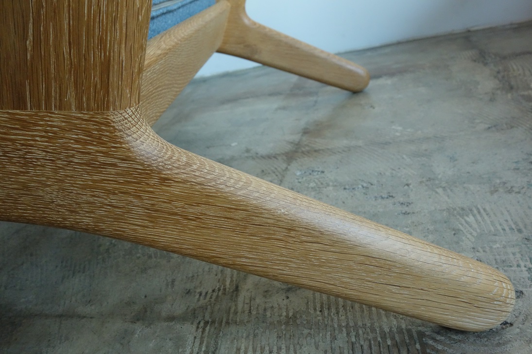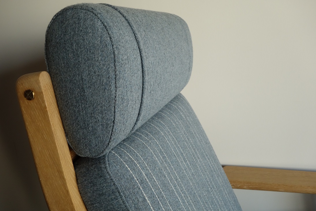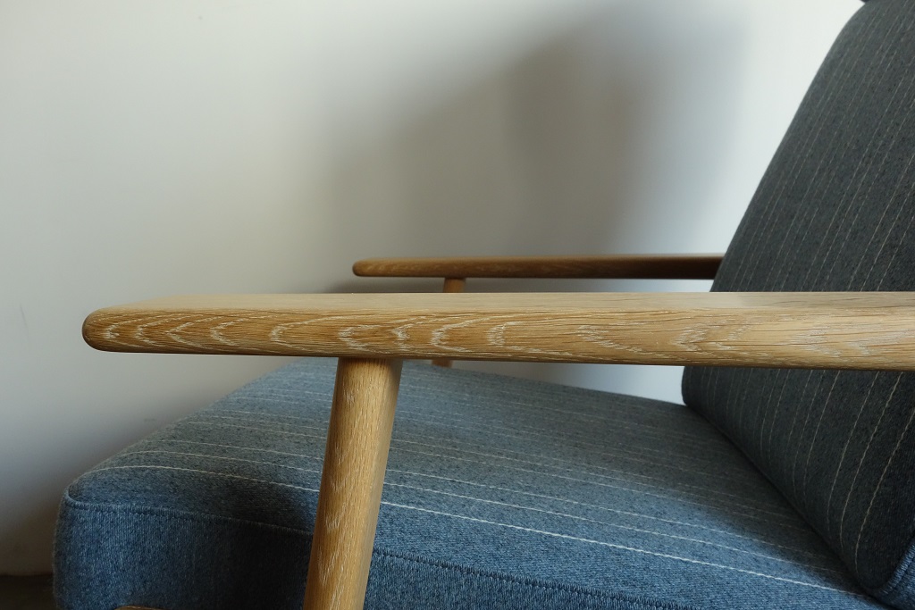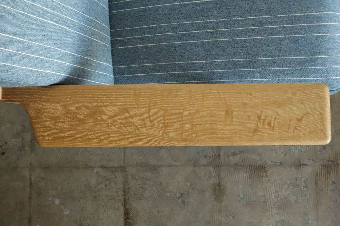 クッションはデンマーク ケヨラップ社製、コットン・ウール混素材の ペールブルーで張替、ウレタン材を全て新規交換済み、内包の スプリングも調整しています。座面下のキルトは新規交換、フレーム は全て古い塗装を剥離し、薄く研磨後にワックスで再塗装仕上げて おります。オーク材の素地の色を活かした仕上げです。 フルメンテナンス済みでの販売となります。