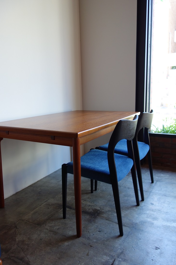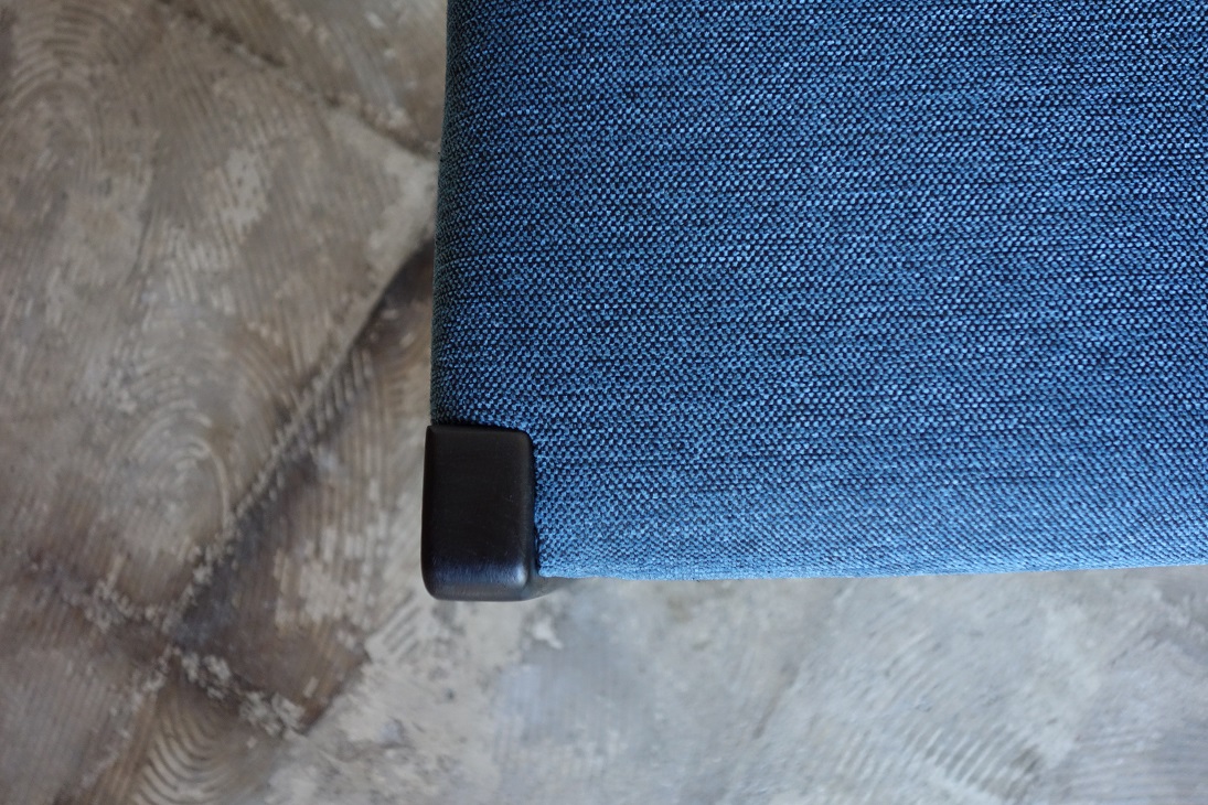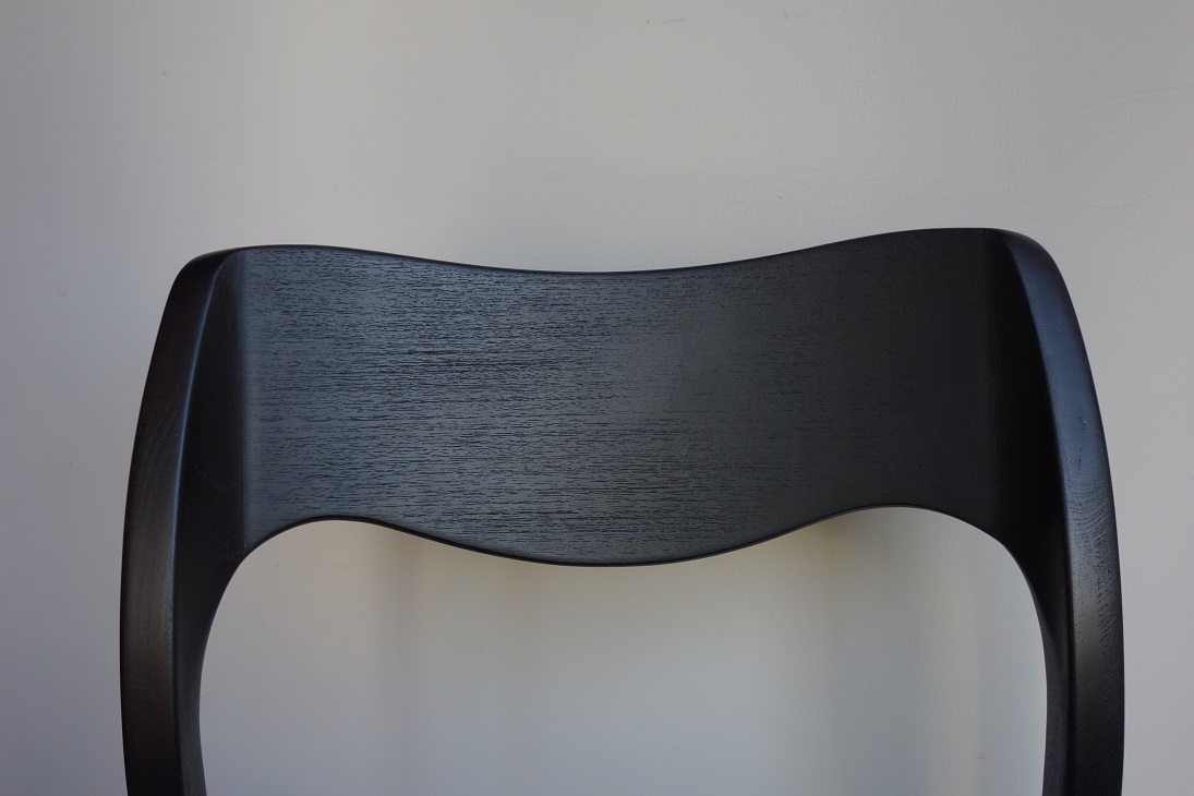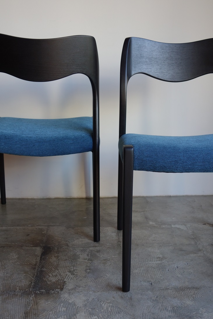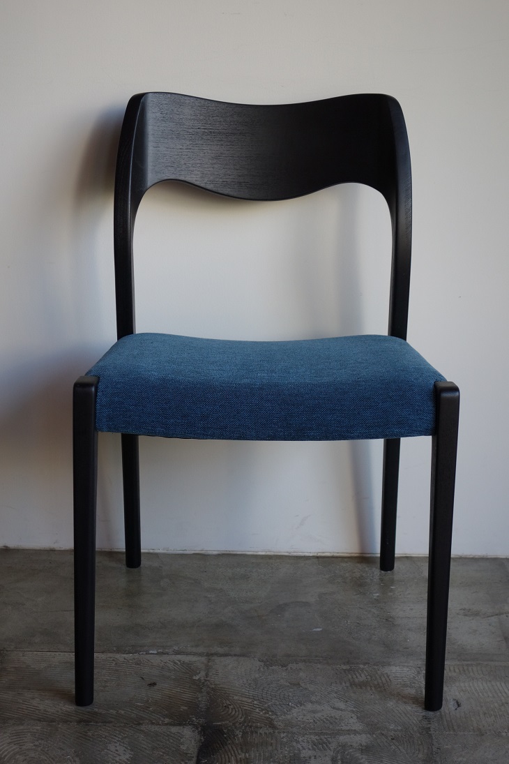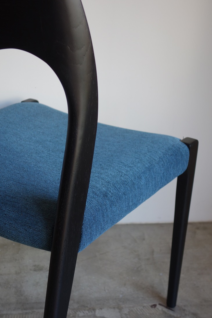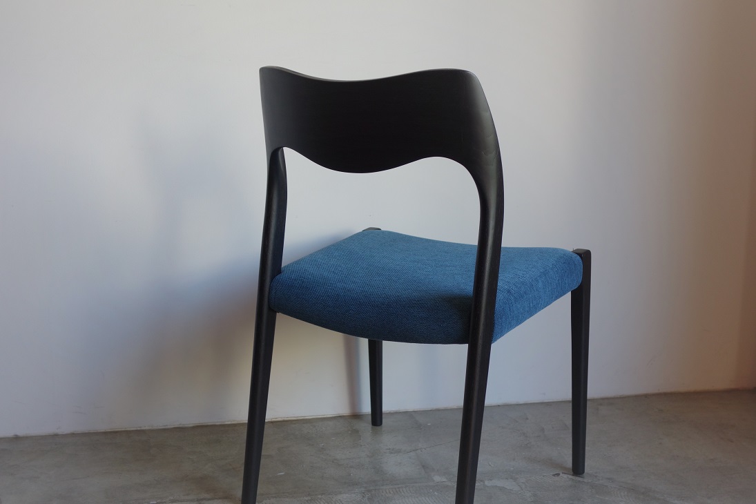 J.LMOLLER 社製1951年Arne Hovmad OLsen デザインのNO.71 ダイニングチェアを紹介します。緩やかに流れる波のような 形状の背もたれのデザインが特徴です。また、背もたれと後ろ脚が 一体化したシャープなフォルムは美しい限りです。フレームは マットブラックで再塗装、座面はイタリア製コットンミックスのブルー ×ブラックカラーの肌触りのよい生地で張替済みです。座面内部の ウレタン、ベルトも新規交換済み、フルメンテナンス済みでの販売