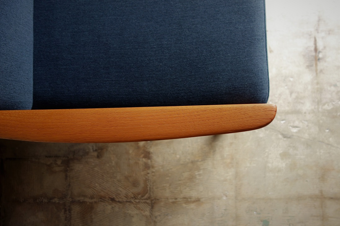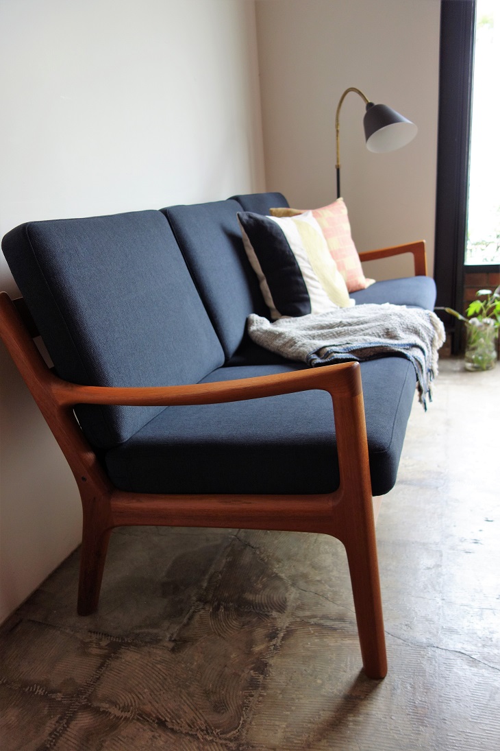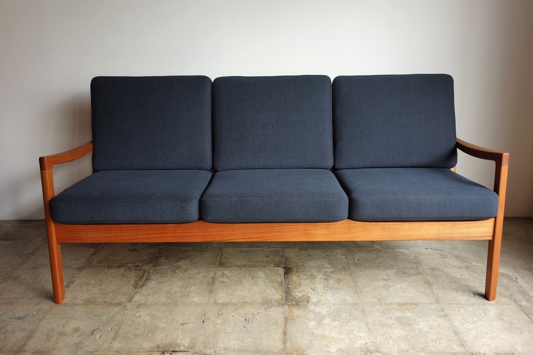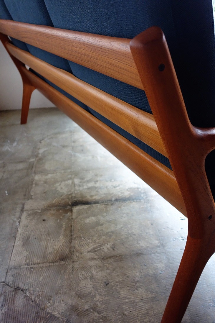 オーレ・ヴァンシャーデザインのNo.166 SENATORシリーズ の3人掛けソファーです。肉厚のチーク無垢材をふんだんに 使用した優しくし柔らかいラインが特徴です。 CADO社製 木部は剥離して再塗装済み、張地は交換前の状態です。 お好きな生地をお選び戴き、内包スプリング調整、内部ウレタン 新規交換しフルメンテナンス後にお引渡しいたします。