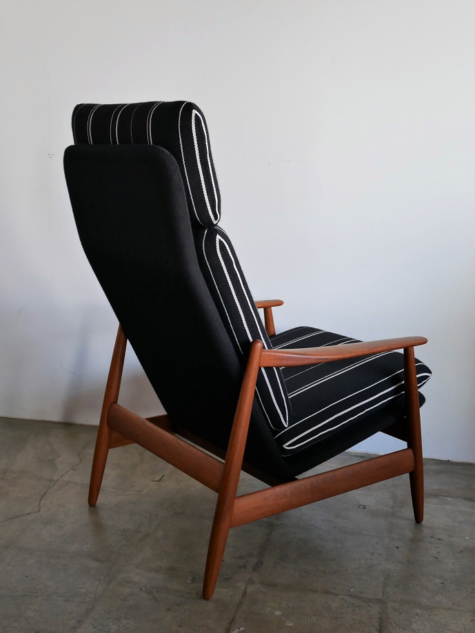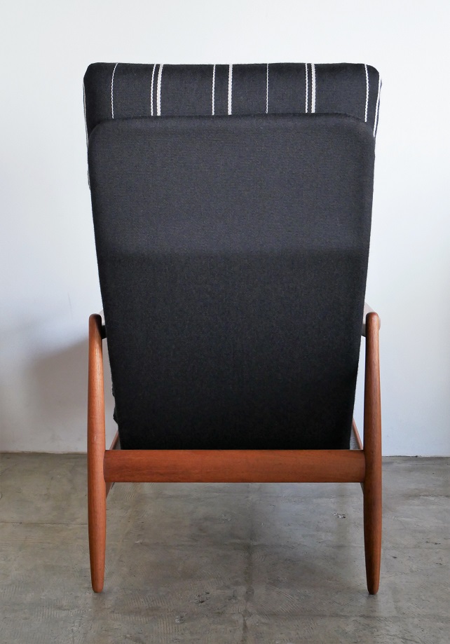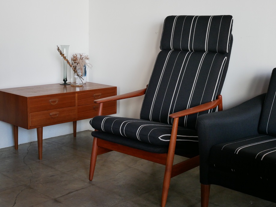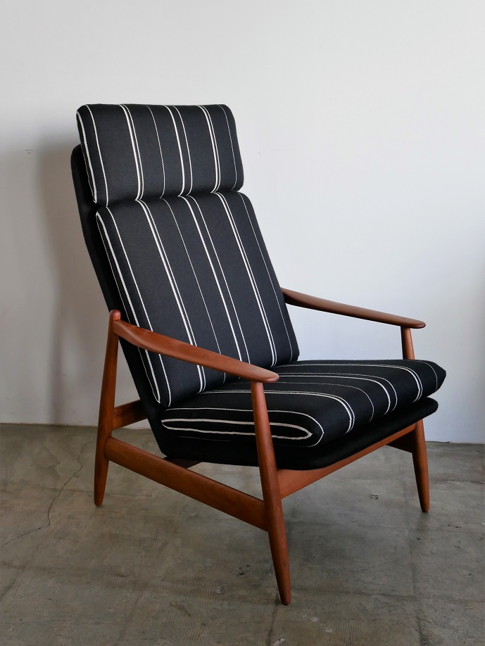 フレームは古い塗装を剥離し、再塗装仕上げ済み 張地はデンマーク Danish Art Weaving 社製の無地+ ストライプの生地で張替済みです。 Frem Rojle社の焼印あり manufacture: Frem Rojle made in Denmark(店頭在庫)