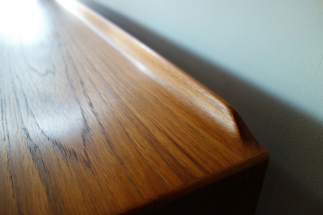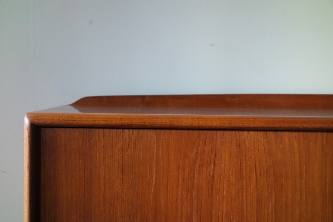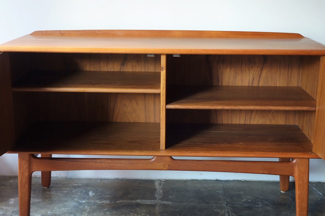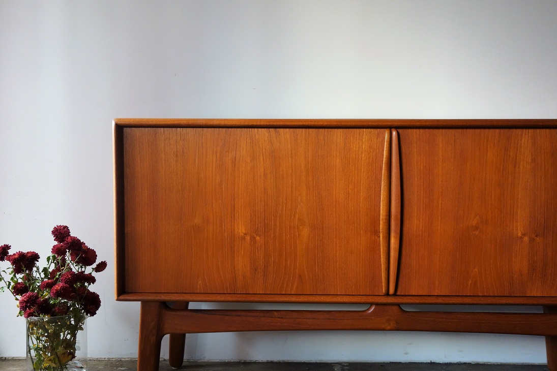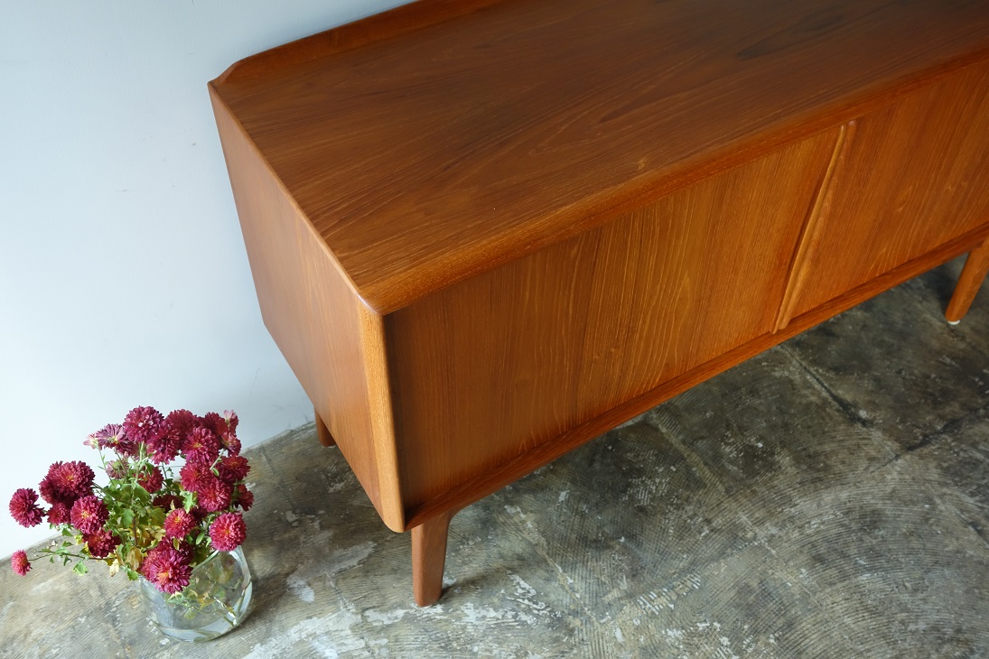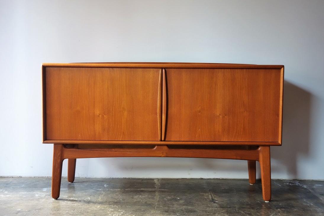Svend Aage Madsen (スヴェンド・アジ・ マドセン) デザインのサイドボードです。天板周囲、ハンドル 脚にいたるまで丸みを強調したデザインが特徴 で、天板の筆返しも滑らかなラインです。 幅125cmとコンパクトで小さめのリビングにも 配置可能なサイズです。