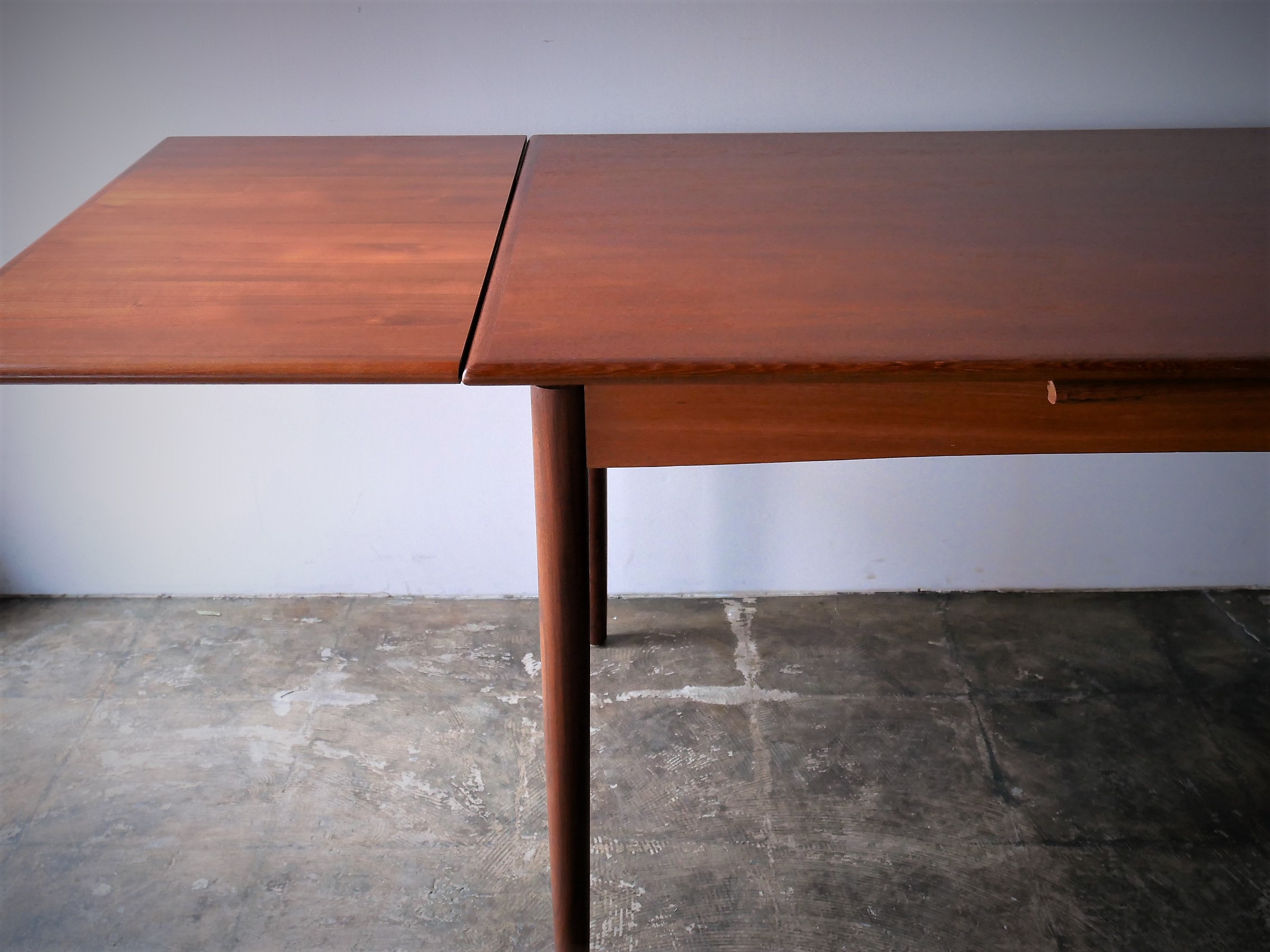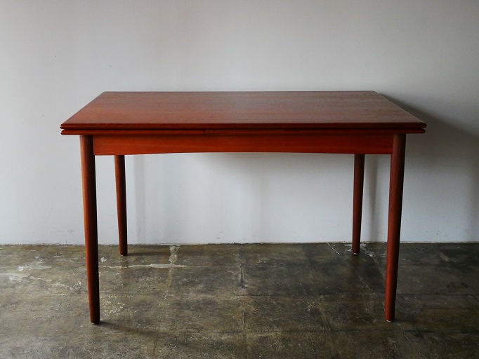 シンプルなデザインのデンマーク製エクステンション付 ダイニングテーブルです。 両サイドのエクステンション 47+47cm で最大幅214cmまで拡張し8名まで使用可能 です。材質はチーク材、古い塗装を剥離後にラッカーで 再塗装仕上済です。水拭き可能な仕上げでお手入れも 簡単です。