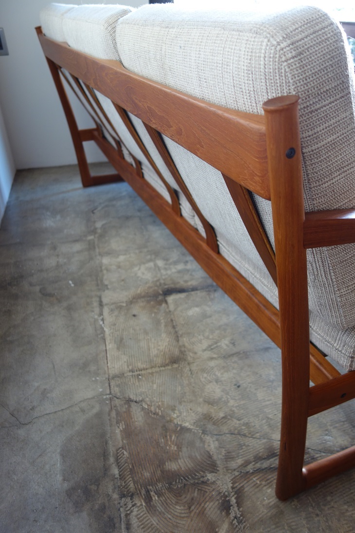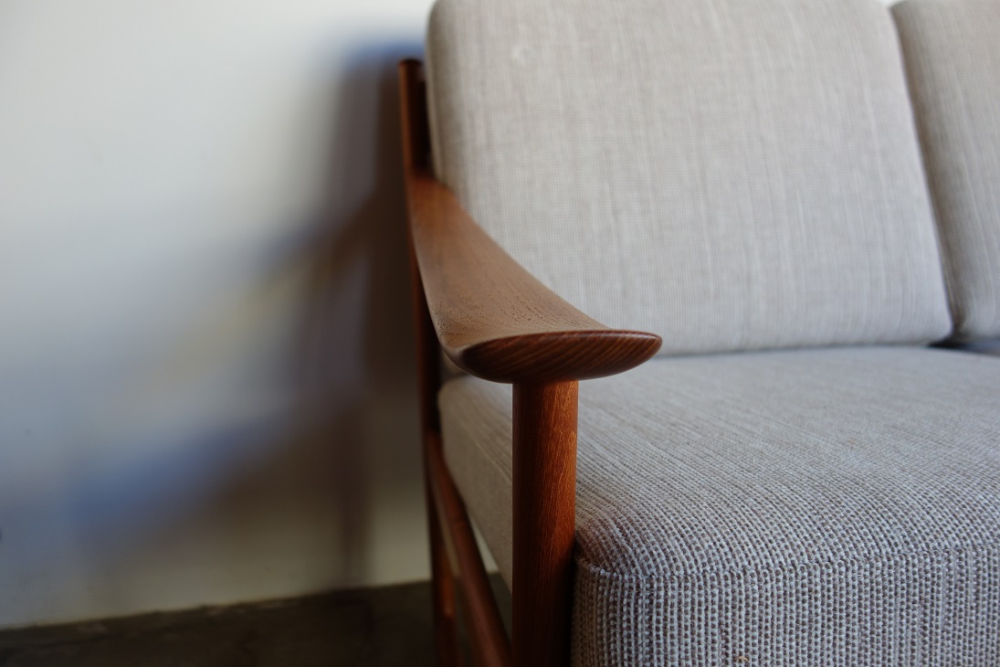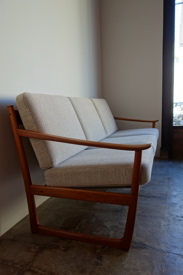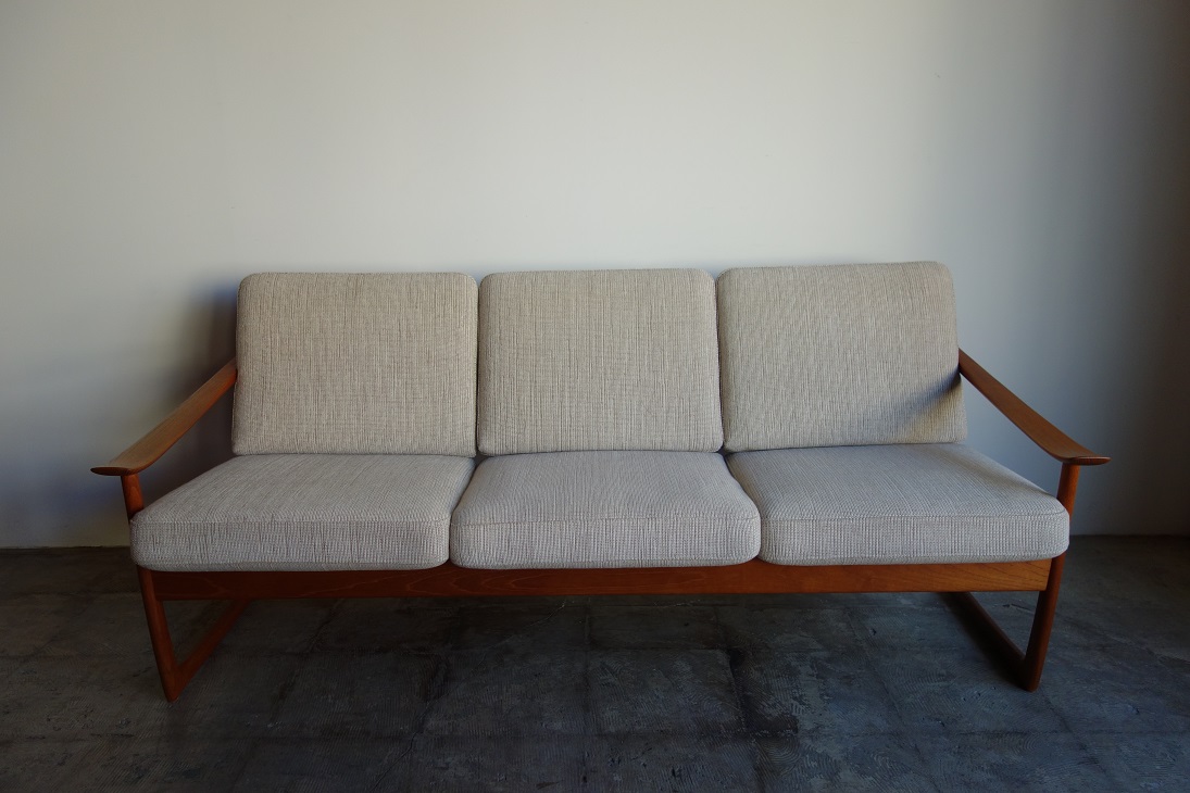 ピーター・ビット&オルラ・ムルガード・ ニールセンによる 3人掛けソファーです。1961年のデザインです。アームレスト、 脚が一体となったソリのようなデザインが特徴です。 張替前の状態です。中材ウレタン新規交換、スプリング調整、 座面下裏地も新規交換してお渡しします。張替費用も含めました 価格です。お選び戴く生地に寄りましてお値段は前後いたします。 座面の高さ43.5cm