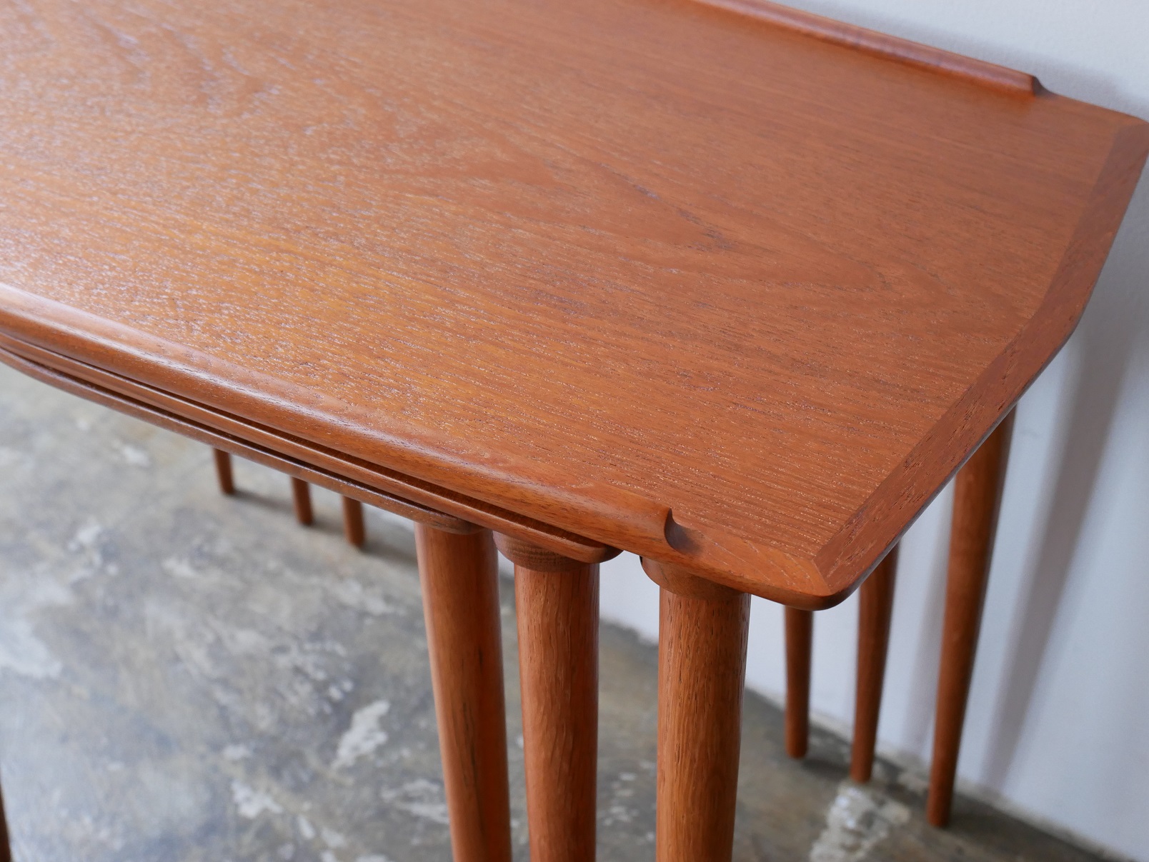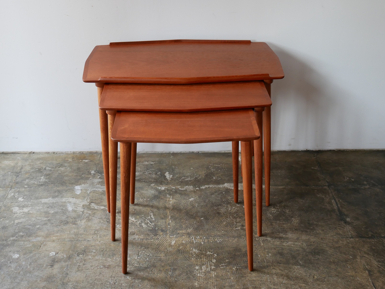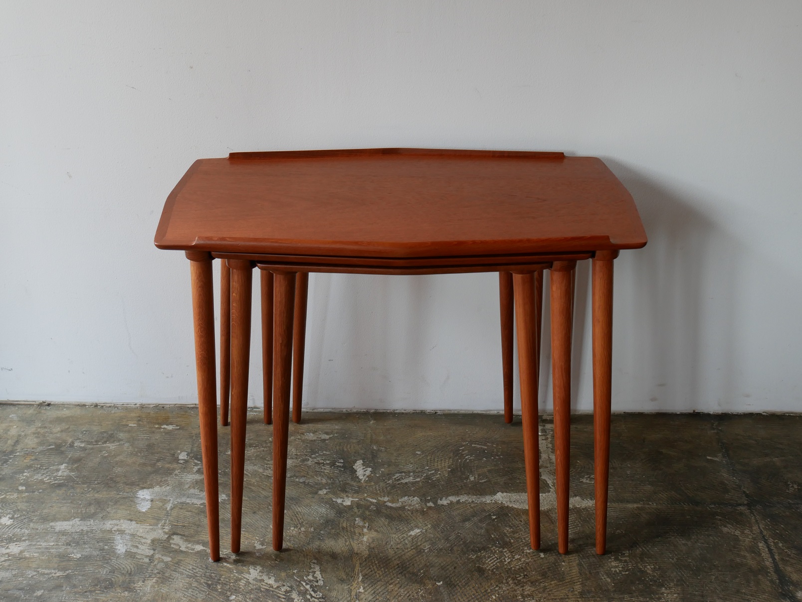 メインテーブルの筆返し、テーパードラインの シャープな脚のラインが特徴のネストテーブル です。柔らかなラインの六角形天板はチーク材、 脚部はオーク材です。