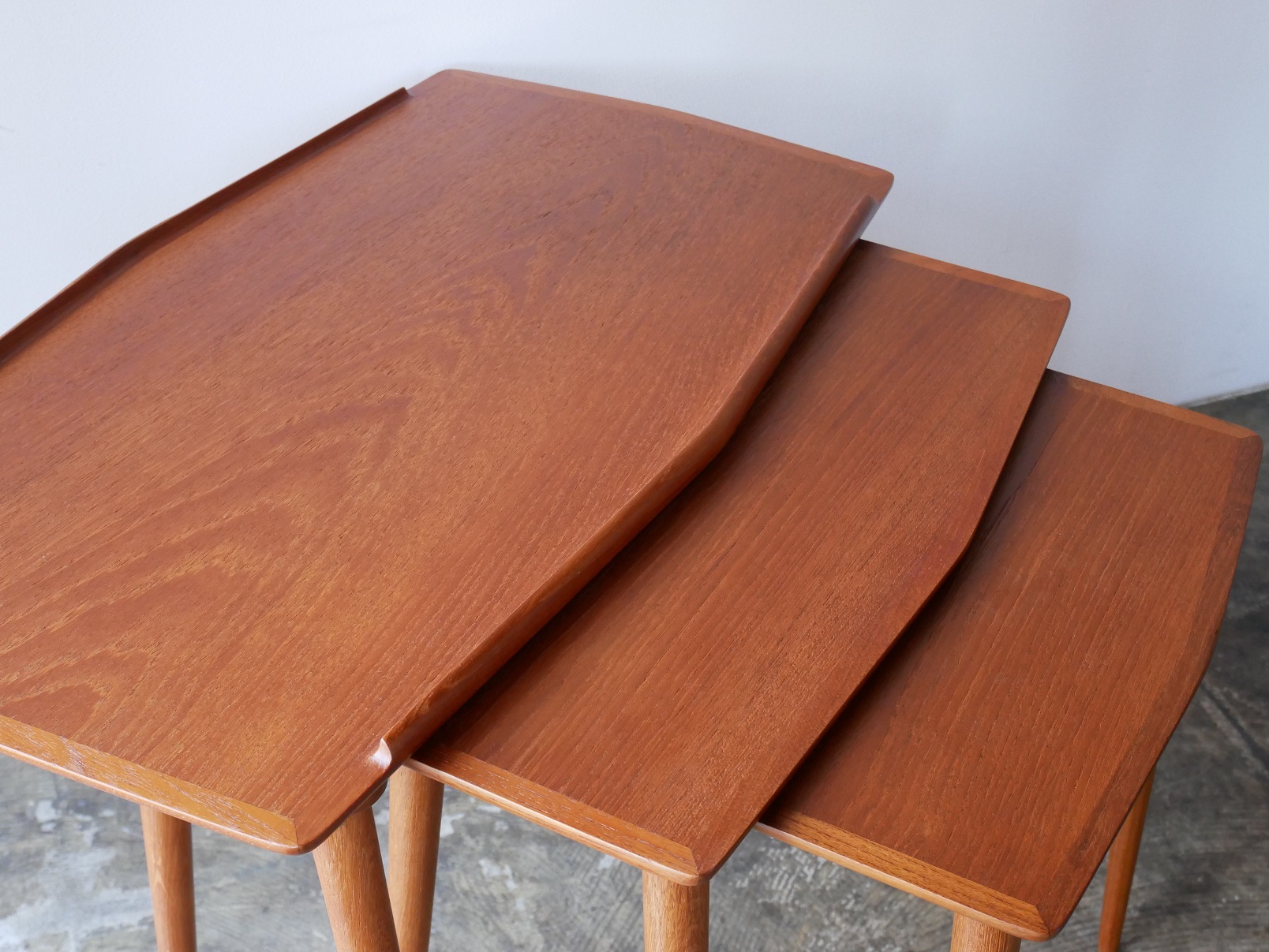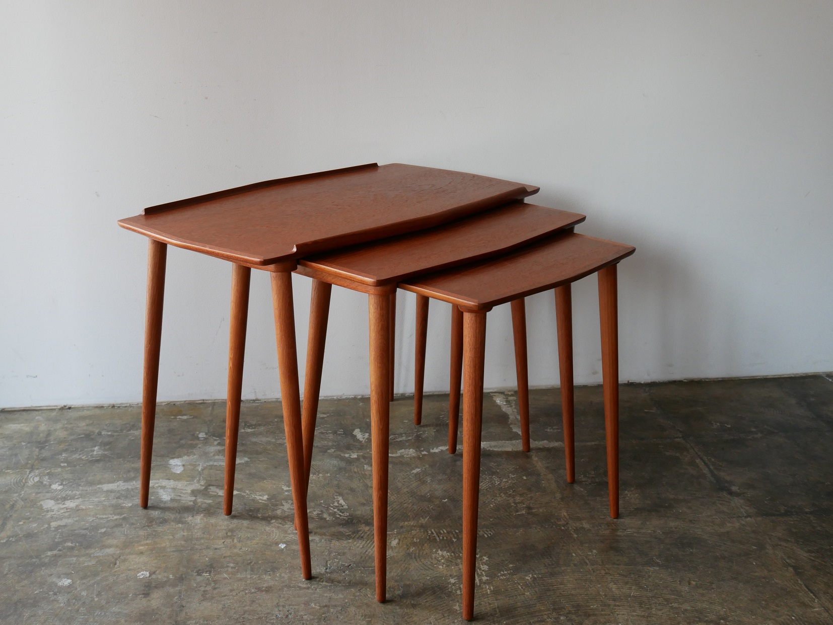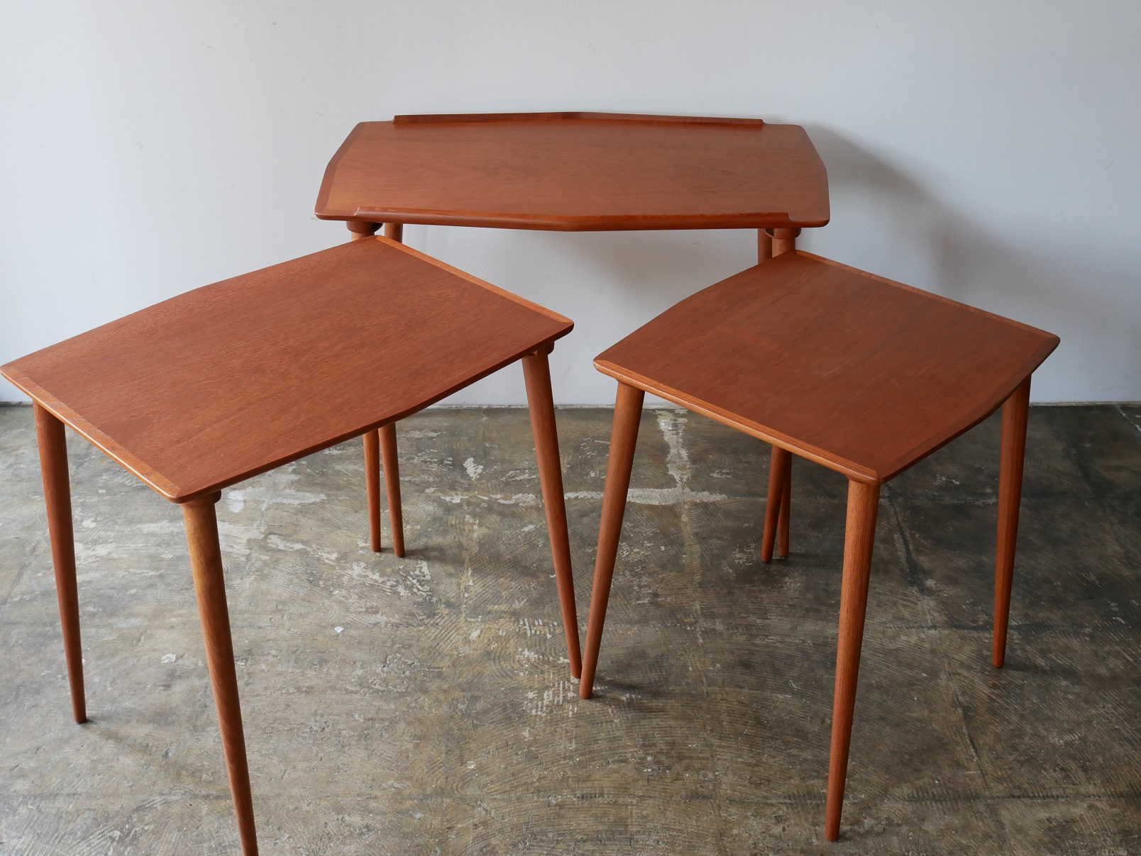 メインテーブルの筆返し、テーパードラインの シャープな脚のラインが特徴のネストテーブル です。柔らかなラインの六角形天板はチーク材、 脚部はオーク材です。