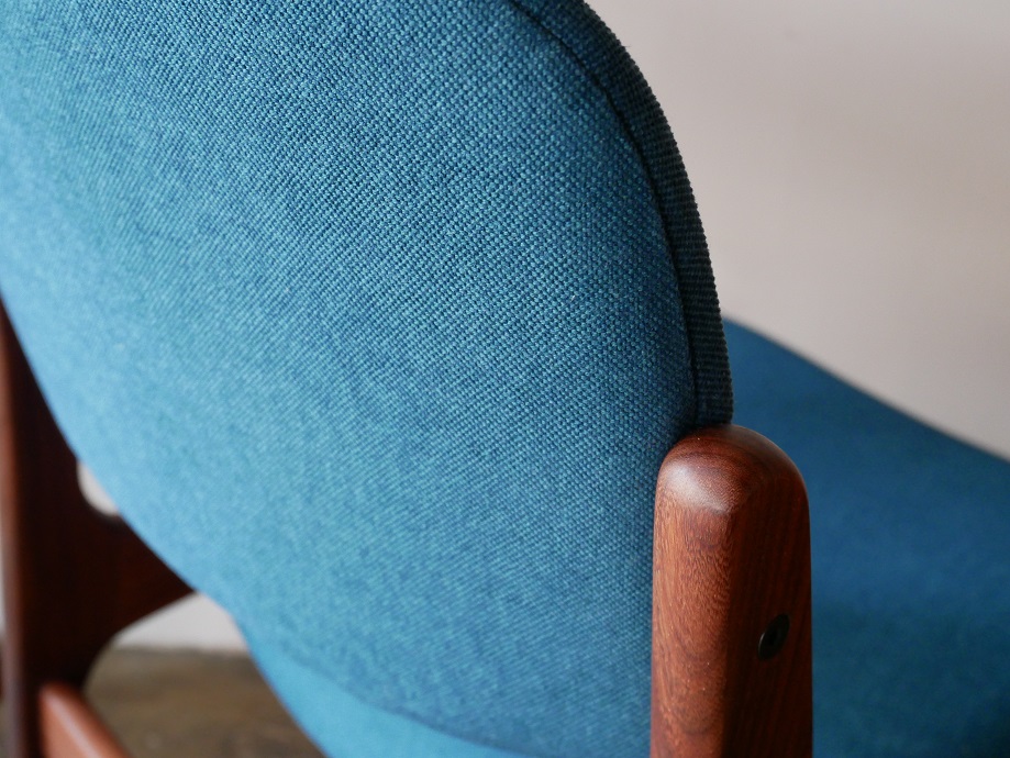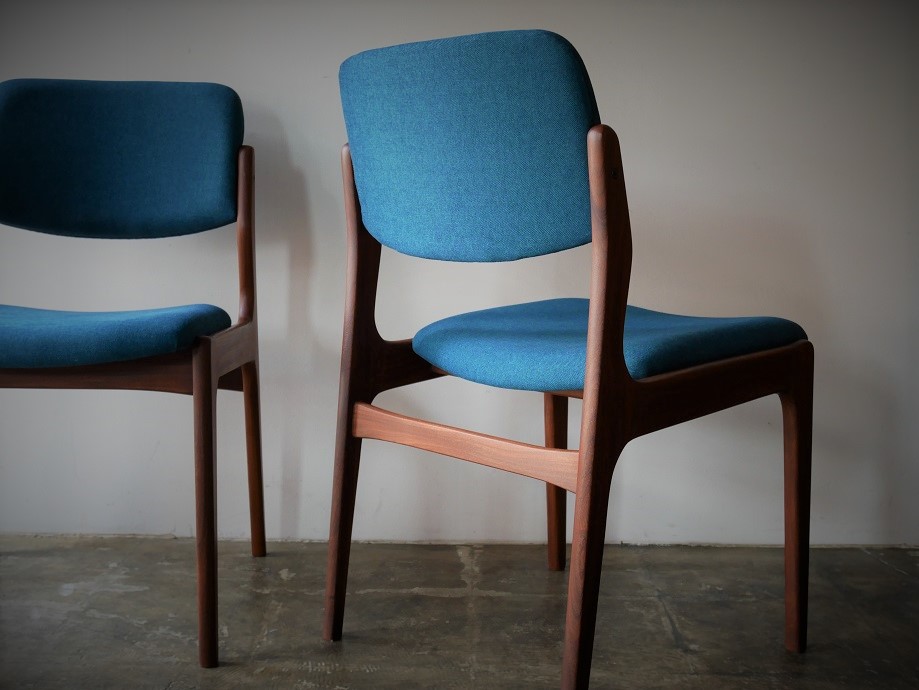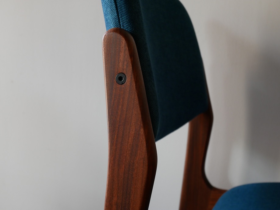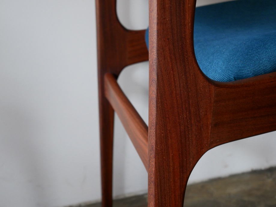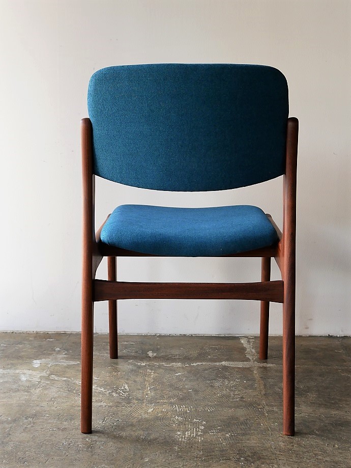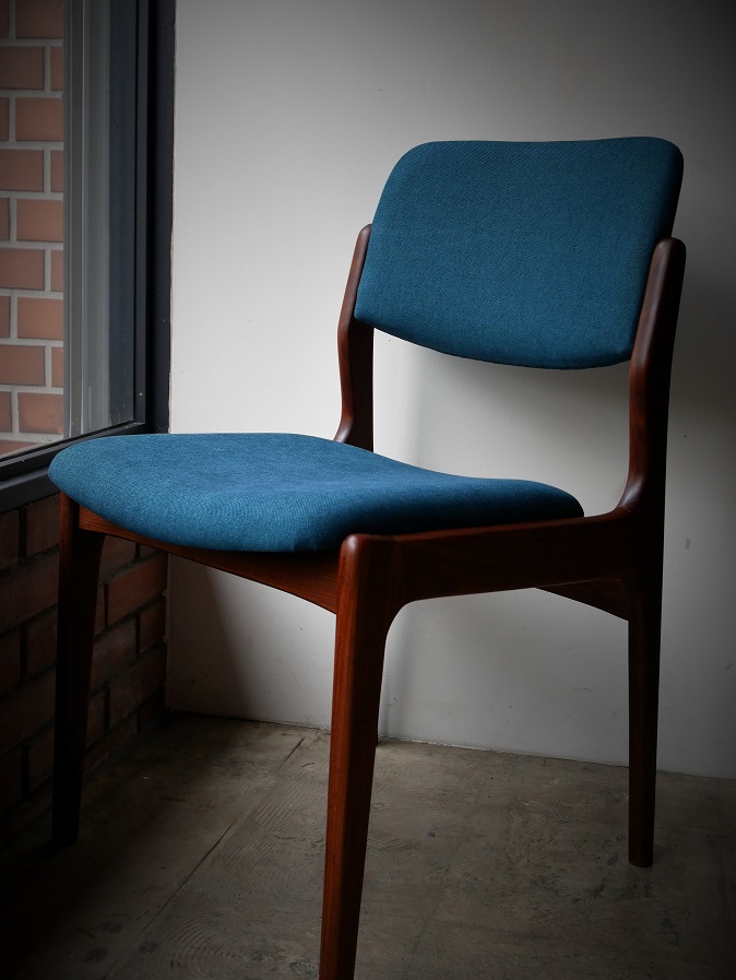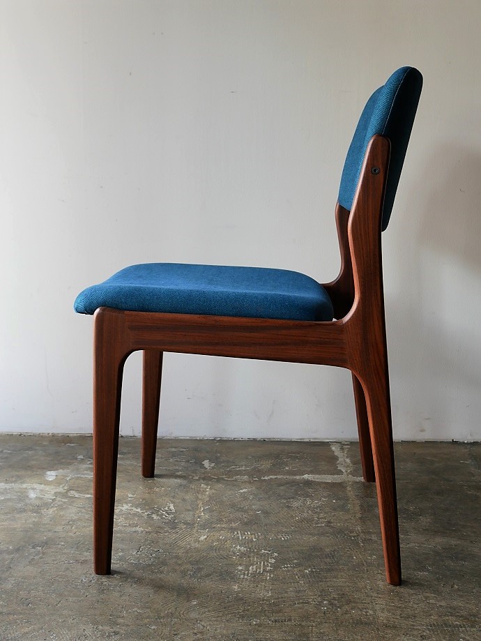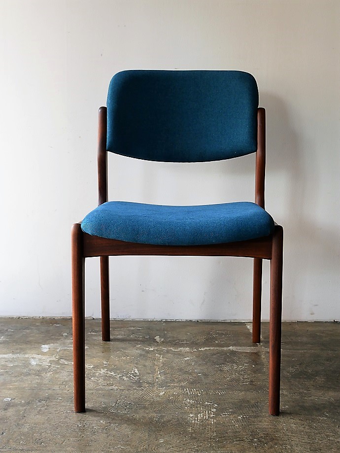 デンマーク製、シャープなフォルムのフレーム が特徴のダイニングチェアです。フレームは 古い塗装を前面剥離後にオイルで再塗装済み、 背座ともにで弾力性の高い中材を使用しスペイン製 コットン混のナイトブルーカラー生地で張替済み。 汚れが付きにくく、水拭き可能な防汚加工生地です。