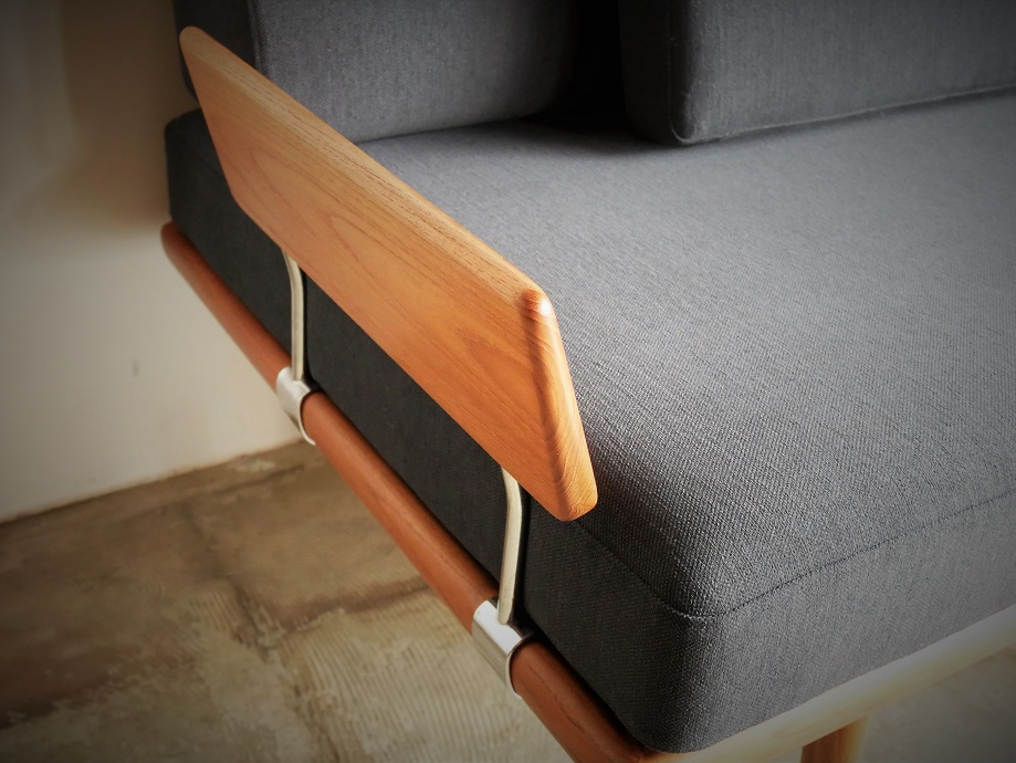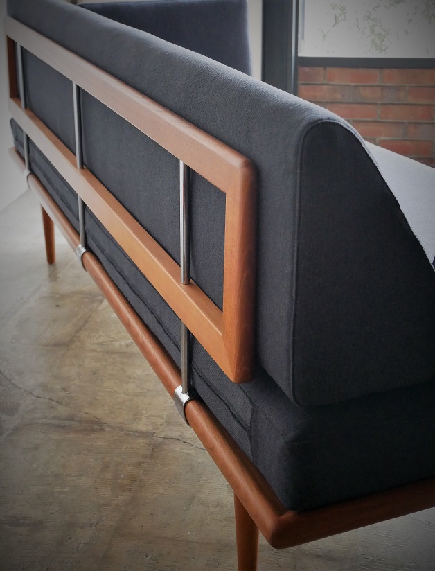 France son 社製、ピーター・ビット&オルラ・ムルガード・ ニールセン デザイン のソファベッドです。 ストレートラインのアームレスト、背もたれ、それぞれを支えるのは シルバーメッキを施したスチール無垢のフレーム、脚はすっきりと テーパードのかかった丸脚、潔くまとめられたデザインに無駄のない 美しさを感じます。木部は古い塗装を剥離し丁寧にサンディング後 オイルで再塗装済みです。クッション内部のウレタンも背、 座、アームレストすべて新規交換致します。座面下スプリング 調整済み、フルメンテナンスを施し販売致します。
