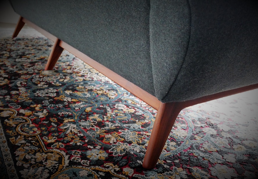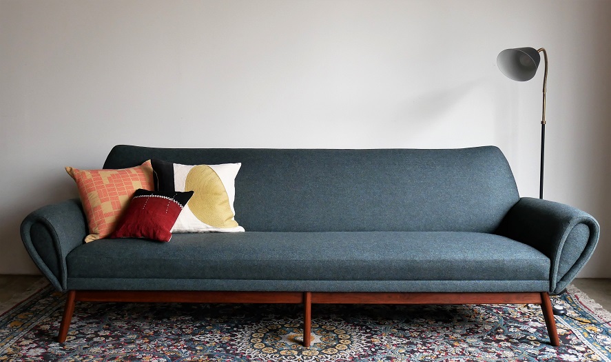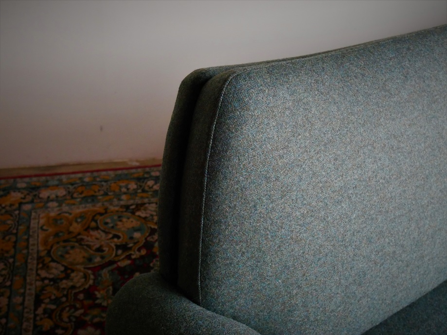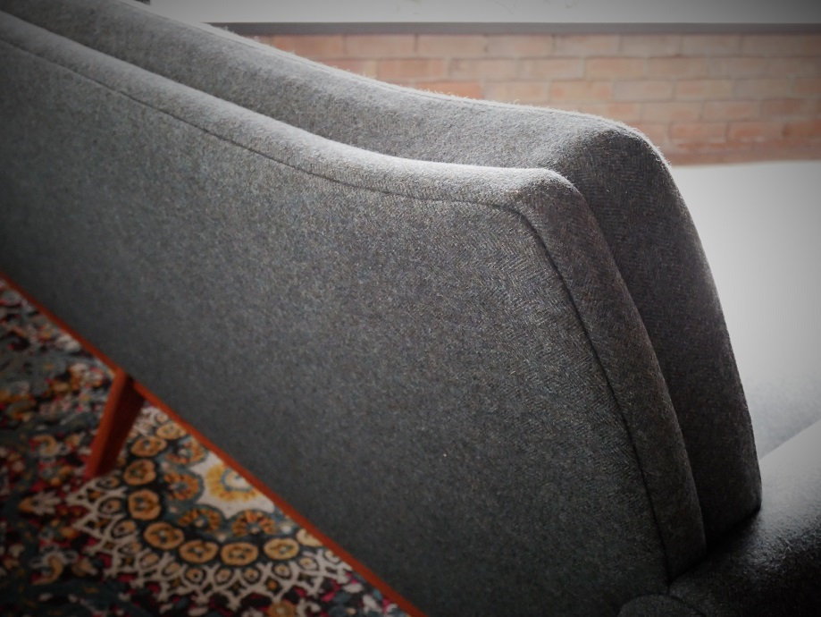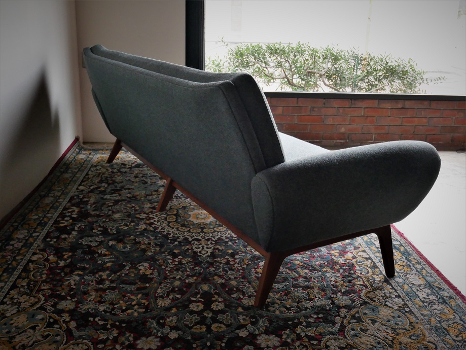 TEARDROP型のアームが 特徴 ヨハネス・アンダーセン デザイン、ゆったりとしたサイズの3人掛けソファです。 材質はチーク+張地は英国MOON社製のウールヘリンボーン で張替済みです。フレームは古い塗装を剥離\後にオイル+ ワックスで再塗装仕上げ済み、中材のウレタン も新規交換済み、背座ともに内包のバネ調整済みです。 フルメンテナンス済みでの販売となります。 座面の高さ40㎝