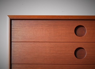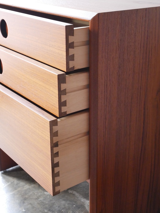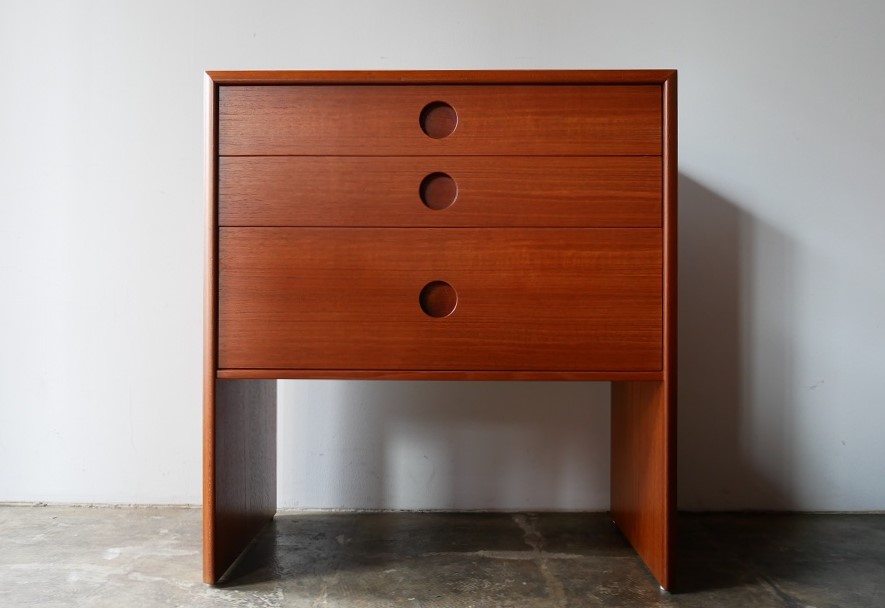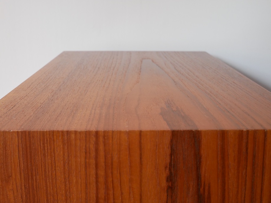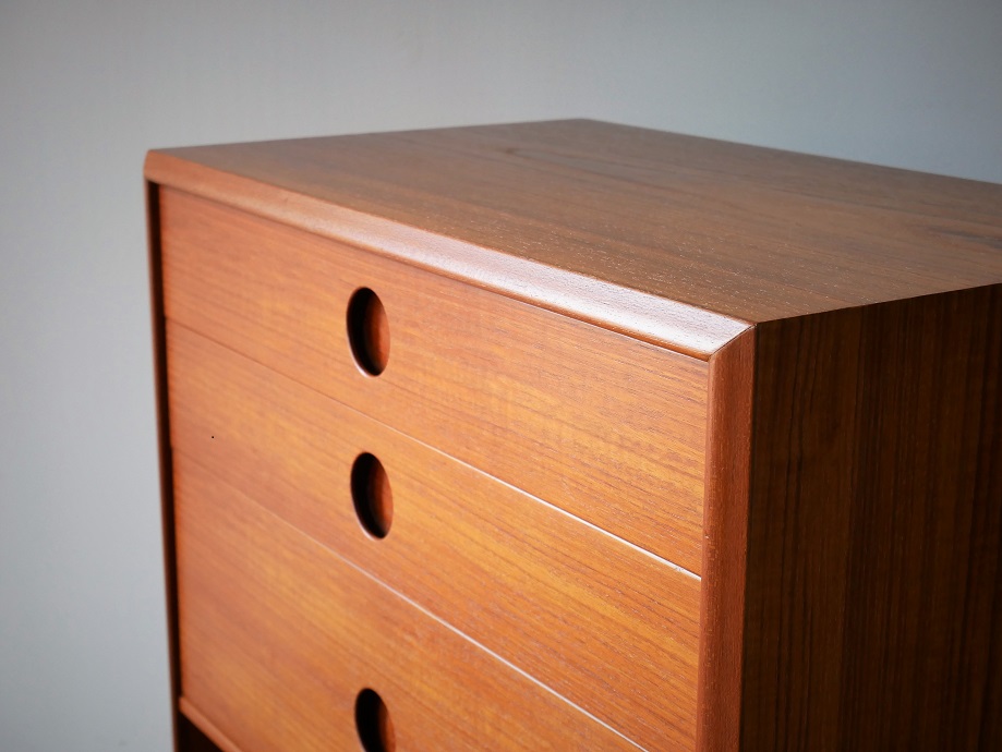 コンパクトなサイズの3段チェスト、材質は チーク材、裏面も同材で仕上げてあり、裏面が 見える位置にも配置できます。 全面再塗装仕上げ済み