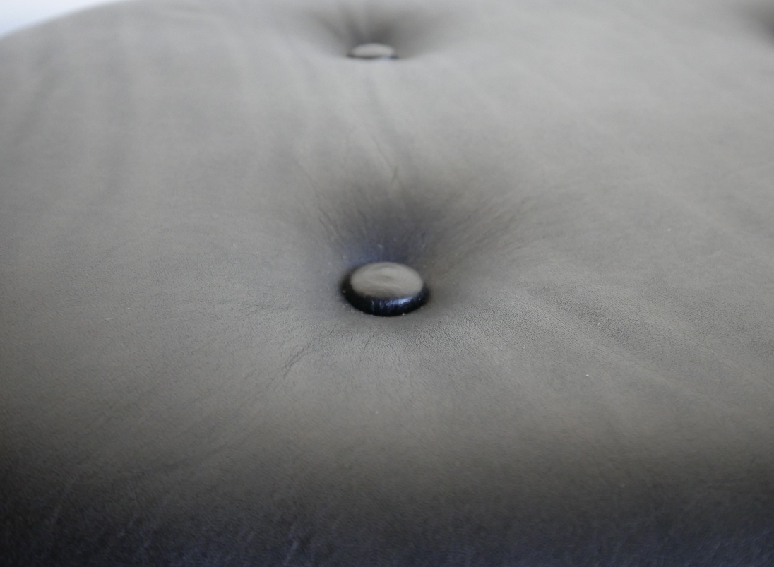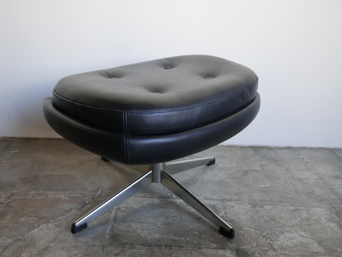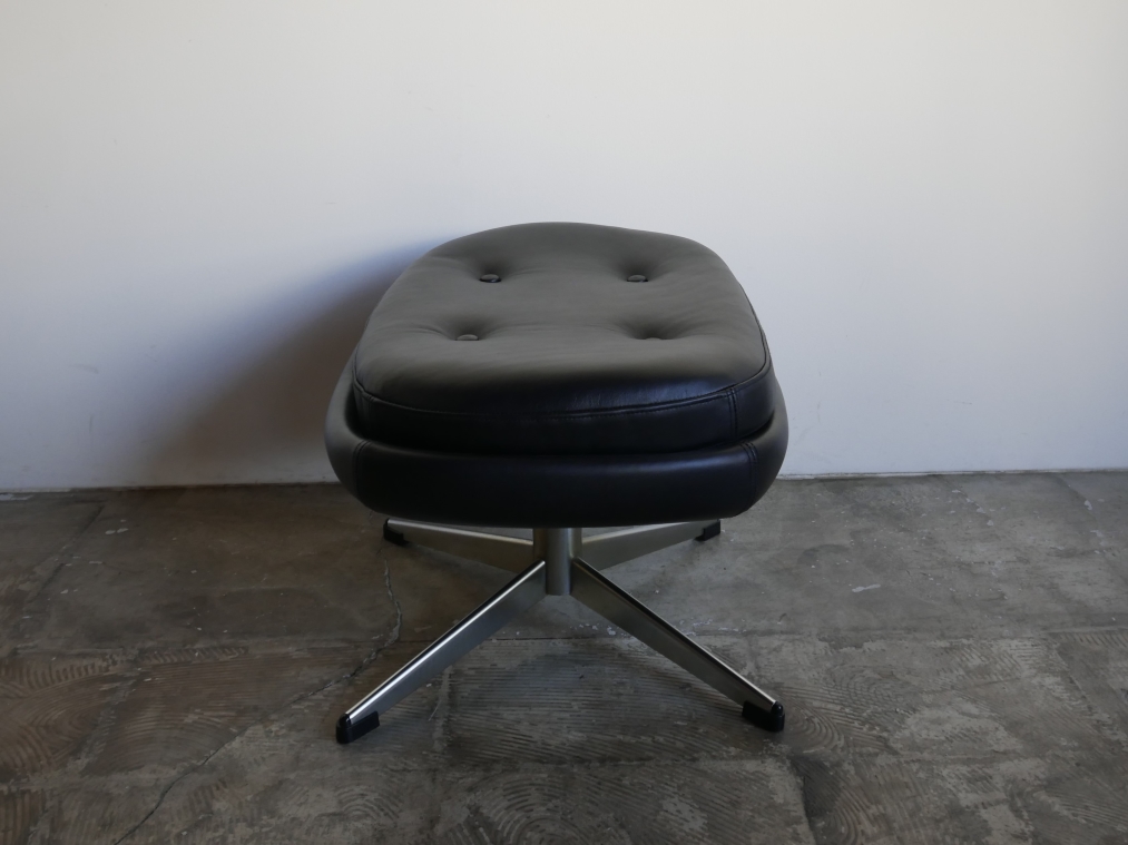 コンパクトなサイズの回転式オットマン、 張地はセミアニリンの牛革ブラックレザーで 張替済みです。オットマンとしては勿論 座面高36㎝と低めなので玄関の靴履き用 スツールとしても最適なサイズです。 脚部スチール