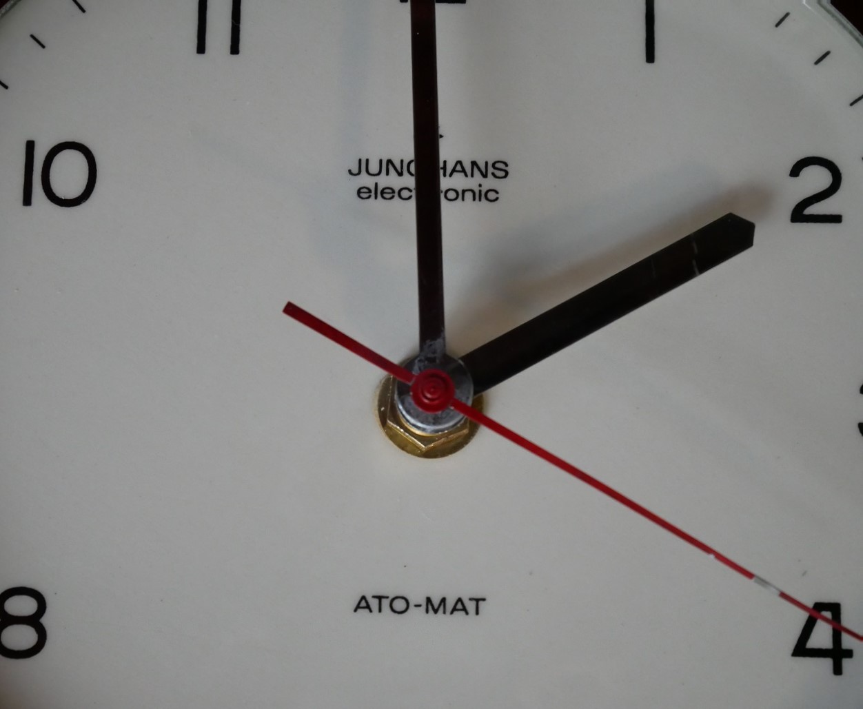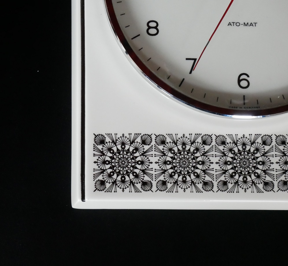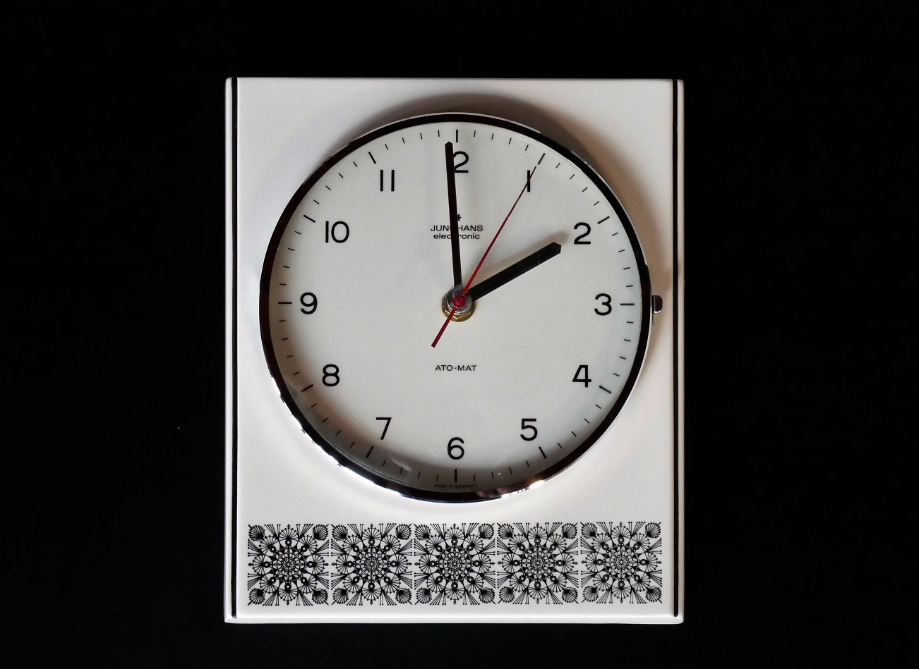 ドイツ ユンハンス社の壁掛け時計です。 アイボリー×幾何模様の陶器製、赤い秒針 がアクセントになっています。 文字盤の直径15cm ムーヴメント交換済み made in Germany